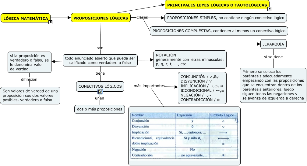 Este Cmap, tiene información relacionada con: PROPOSICIONES LÓGICAS, PROPOSICIONES LÓGICAS son todo enunciado abierto que pueda ser calificado como verdadero o falso, CONECTIVOS LÓGICOS más importantes CONJUNCIÓN / ∧,&,⋅ DISYUNCIÓN / ∨ IMPLICACIÓN / →,⊃, ⇒ BICONDICIONAL / ↔,≡ NEGACIÓN / ¬,~ CONTRADICCIÓN / ⊕, JERARQUÍA si se tiene Primero se coloca los paréntesis adecuadamente empezando con las proposiciones que se encuentran dentro de los paréntesis anteriores, luego siguen todas las negaciones y se avanza de izquierda a derecha, todo enunciado abierto que pueda ser calificado como verdadero o falso tiene CONECTIVOS LÓGICOS, CONECTIVOS LÓGICOS más importantes, si la proposición es verdadero o falso, se le denomina valor de verdad. difinición Son valores de verdad de una proposición sus dos valores posibles, verdadero o falso, PROPOSICIONES LÓGICAS clases PROPOSICIONES SIMPLES, no contiene ningún conectivo lógico, todo enunciado abierto que pueda ser calificado como verdadero o falso ???? si la proposición es verdadero o falso, se le denomina valor de verdad., PROPOSICIONES COMPUESTAS, contienen al menos un conectivo lógico . JERARQUÍA, CONECTIVOS LÓGICOS unen dos o más proposiciones, LÓGICA MATEMÁTICA ???? PROPOSICIONES LÓGICAS, PROPOSICIONES LÓGICAS clases PROPOSICIONES COMPUESTAS, contienen al menos un conectivo lógico, PROPOSICIONES LÓGICAS ???? PRINCIPALES LEYES LÓGICAS O TAUTOLÓGICAS, todo enunciado abierto que pueda ser calificado como verdadero o falso ???? NOTACIÓN generalmente con letras minusculas: p, q, r, t, ..., etc.