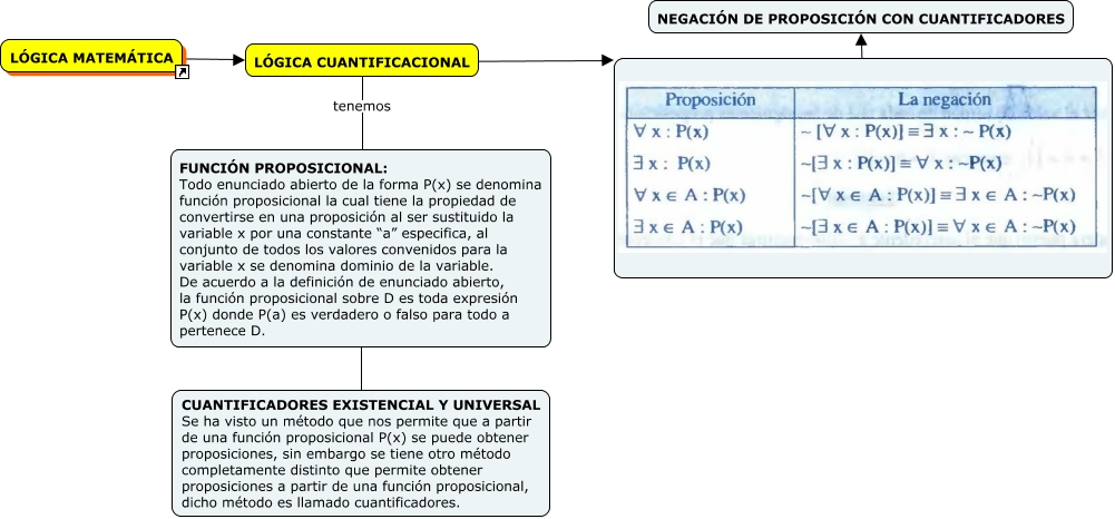 Este Cmap, tiene información relacionada con: LÓGICA CUANTIFICACIONAL, LÓGICA CUANTIFICACIONAL ????, ???? NEGACIÓN DE PROPOSICIÓN CON CUANTIFICADORES, LÓGICA MATEMÁTICA ???? LÓGICA CUANTIFICACIONAL, LÓGICA CUANTIFICACIONAL tenemos FUNCIÓN PROPOSICIONAL: Todo enunciado abierto de la forma P(x) se denomina función proposicional la cual tiene la propiedad de convertirse en una proposición al ser sustituido la variable x por una constante “a” especifica, al conjunto de todos los valores convenidos para la variable x se denomina dominio de la variable. De acuerdo a la definición de enunciado abierto, la función proposicional sobre D es toda expresión P(x) donde P(a) es verdadero o falso para todo a pertenece D., FUNCIÓN PROPOSICIONAL: Todo enunciado abierto de la forma P(x) se denomina función proposicional la cual tiene la propiedad de convertirse en una proposición al ser sustituido la variable x por una constante “a” especifica, al conjunto de todos los valores convenidos para la variable x se denomina dominio de la variable. De acuerdo a la definición de enunciado abierto, la función proposicional sobre D es toda expresión P(x) donde P(a) es verdadero o falso para todo a pertenece D. ???? CUANTIFICADORES EXISTENCIAL Y UNIVERSAL Se ha visto un método que nos permite que a partir de una función proposicional P(x) se puede obtener proposiciones, sin embargo se tiene otro método completamente distinto que permite obtener proposiciones a partir de una función proposicional, dicho método es llamado cuantificadores.