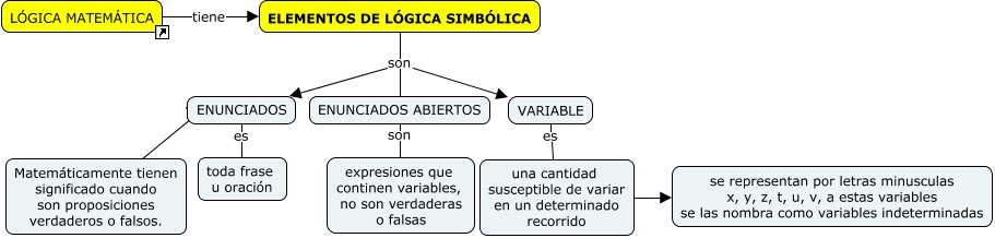 Este Cmap, tiene información relacionada con: ELEMENTOS DE LÓGICA SIMBÓLICA, una cantidad susceptible de variar en un determinado recorrido ???? se representan por letras minusculas x, y, z, t, u, v, a estas variables se las nombra como variables indeterminadas, ELEMENTOS DE LÓGICA SIMBÓLICA son ENUNCIADOS, ENUNCIADOS ABIERTOS son expresiones que continen variables, no son verdaderas o falsas, ELEMENTOS DE LÓGICA SIMBÓLICA son ENUNCIADOS ABIERTOS, LÓGICA MATEMÁTICA tiene ELEMENTOS DE LÓGICA SIMBÓLICA, ENUNCIADOS es toda frase u oración, VARIABLE es una cantidad susceptible de variar en un determinado recorrido, ENUNCIADOS ???? Matemáticamente tienen significado cuando son proposiciones verdaderos o falsos., ELEMENTOS DE LÓGICA SIMBÓLICA son VARIABLE