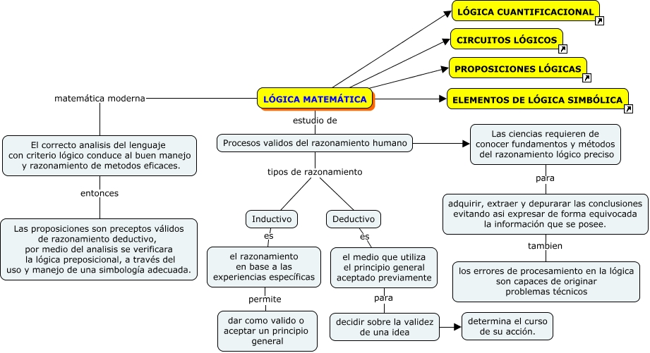 Este Cmap, tiene información relacionada con: LÓGICA MATEMÁTICA, LÓGICA MATEMÁTICA estudio de Procesos validos del razonamiento humano, Procesos validos del razonamiento humano tipos de razonamiento Inductivo, Procesos validos del razonamiento humano tipos de razonamiento Deductivo, Las ciencias requieren de conocer fundamentos y métodos del razonamiento lógico preciso para adquirir, extraer y depurarar las conclusiones evitando asi expresar de forma equivocada la información que se posee., adquirir, extraer y depurarar las conclusiones evitando asi expresar de forma equivocada la información que se posee. tambien los errores de procesamiento en la lógica son capaces de originar problemas técnicos, LÓGICA MATEMÁTICA ELEMENTOS DE LÓGICA SIMBÓLICA, LÓGICA MATEMÁTICA . PROPOSICIONES LÓGICAS, LÓGICA MATEMÁTICA ???? LÓGICA CUANTIFICACIONAL, el razonamiento en base a las experiencias específicas permite dar como valido o aceptar un principio general, LÓGICA MATEMÁTICA ???? CIRCUITOS LÓGICOS, Inductivo es el razonamiento en base a las experiencias específicas, Procesos validos del razonamiento humano ???? Las ciencias requieren de conocer fundamentos y métodos del razonamiento lógico preciso, El correcto analisis del lenguaje con criterio lógico conduce al buen manejo y razonamiento de metodos eficaces. entonces Las proposiciones son preceptos válidos de razonamiento deductivo, por medio del analisis se verificara la lógica preposicional, a través del uso y manejo de una simbología adecuada., LÓGICA MATEMÁTICA matemática moderna El correcto analisis del lenguaje con criterio lógico conduce al buen manejo y razonamiento de metodos eficaces., Deductivo es el medio que utiliza el principio general aceptado previamente, decidir sobre la validez de una idea ???? determina el curso de su acción., el medio que utiliza el principio general aceptado previamente para decidir sobre la validez de una idea