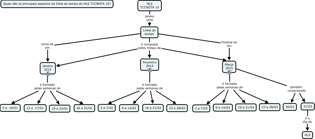 This Concept Map, created with IHMC CmapTools, has information related to: Linha do tempo HLS, Fevereiro 2015 é formado pelas semanas de 9 a 14/02, Fevereiro 2015 é formado pelas semanas de 2 a 7/02, Linha do tempo é composta pelos meses de Março 2015, Março 2015 é formado pelas semanas de 23 a 28/03, Janeiro 2015 é formado pelas semanas de 19 a 24/01, Linha do tempo é composta pelos meses de Janeiro 2015, Março 2015 é formado pelas semanas de 9 a 14/03, Março 2015 também compreende 30/03, Março 2015 é formado pelas semanas de 16 a 21/03, Fevereiro 2015 é formado pelas semanas de 16 a 21/02, Março 2015 é formado pelas semanas de 2 a 7/03, Janeiro 2015 é formado pelas semanas de 5 a 10/01, HLS TCCNOTA 10 possui uma Linha do tempo, Janeiro 2015 é formado pelas semanas de 26 a 31/01, Janeiro 2015 é formado pelas semanas de 12 a 17/01, Linha do tempo é composta pelos meses de Fevereiro 2015, Linha do tempo inicia-se em Janeiro 2015, Linha do tempo Finaliza-se em Março 2015, 31/03 é o dia do HLS, Fevereiro 2015 é formado pelas semanas de 23 a 28/02