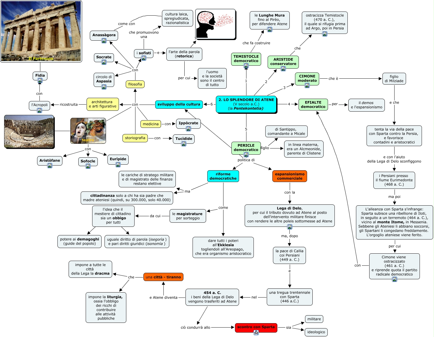 Questa Cmap, creata con IHMC CmapTools, contiene informazioni relative a: Splendore di Atene, la pace di Callia coi Persiani (449 a. C.) e una tregua trentennale con Sparta (446 a.C.), medicina con Ippòcrate, l'idea che il mestiere di cittadino sia un obbigo per tutti da cui uguale diritto di parola (isegorìa) e pari diritti giuridici (isonomìa), PERICLE democratico figlio in linea materna, era un Alcmeonide, parente di Clistene, 2. LO SPLENDORE DI ATENE (V secolo a.C.) (la Pentekontetìa) 1 TEMISTOCLE democratico, riforme democratiche come le magistrature per sorteggio, sviluppo della cultura con filosofia, i sofisti e l'arte della parola (retorica), storiografia con Tucìdide, i sofisti che promuovono una cultura laica, spregiudicata, razionalistica, tenta la via della pace con Sparta contro la Persia, e favorisce contadini e aristocratici e con l'aiuto della Lega di Delo sconfiggono i Persiani presso il fiume Eurimedonte (468 a. C.), PERICLE democratico figlio di Santippo, comandante a Micale, 454 a. C. i beni della Lega di Delo vengono trasferiti ad Atene e Atene diventa una città - tiranno, teatro con Aristòfane, scontro con Sparta sia ideologico, filosofia con Anassàgora, 2. LO SPLENDORE DI ATENE (V secolo a.C.) (la Pentekontetìa) 5 PERICLE democratico, l'idea che il mestiere di cittadino sia un obbigo per tutti da cui potere ai demagoghi (guide del popolo), l'Acropoli con Fidia, ARISTIDE conservatore che ostracizza Temistocle (470 a. C.), il quale si rifugia prima ad Argo, poi in Persia
