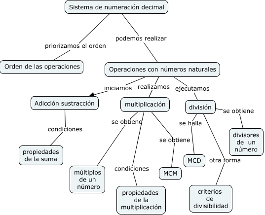 Este Cmap, tiene información relacionada con: sistema de numeración decimal, división otra forma criterios de divisibilidad, Operaciones con números naturales realizamos multiplicación, Operaciones con números naturales iniciamos Adicción sustracción, Sistema de numeración decimal podemos realizar Operaciones con números naturales, multiplicación condiciones propiedades de la multiplicación, Operaciones con números naturales ejecutamos división, multiplicación se obtiene MCM, multiplicación se obtiene múltiplos de un número, Sistema de numeración decimal priorizamos el orden Orden de las operaciones, Adicción sustracción condiciones propiedades de la suma, división se obtiene divisores de un número, división se halla MCD