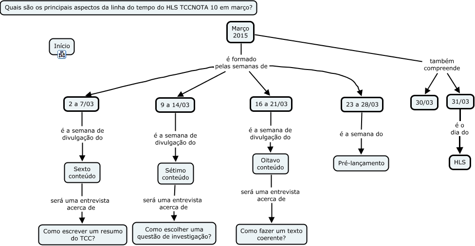 This Concept Map, created with IHMC CmapTools, has information related to: Linha do tempo marco 2015, Oitavo conteúdo será uma entrevista acerca de Como fazer um texto coerente?, Março 2015 também compreende 31/03, Sétimo conteúdo será uma entrevista acerca de Como escolher uma questão de investigação?, Março 2015 também compreende 30/03, 23 a 28/03 é a semana do Pré-lançamento, 9 a 14/03 é a semana de divulgação do Sétimo conteúdo, 2 a 7/03 é a semana de divulgação do Sexto conteúdo, Sexto conteúdo será uma entrevista acerca de Como escrever um resumo do TCC?, 31/03 é o dia do HLS, Março 2015 é formado pelas semanas de 23 a 28/03, Março 2015 é formado pelas semanas de 9 a 14/03, Março 2015 é formado pelas semanas de 2 a 7/03, 16 a 21/03 é a semana de divulgação do Oitavo conteúdo, Março 2015 é formado pelas semanas de 16 a 21/03