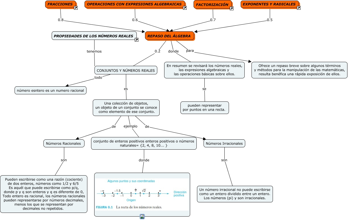 Este Cmap, tiene información relacionada con: REPASO DEL ÁLGEBRA, Una colección de objetos, un objeto de un conjunto se conoce como elemento de ese conjunto. de Números Irracionales, Números Irracionales son Un número irracional no puede escribirse como un entero dividido entre un entero. Los números (pi) y son irracionales., PROPIEDADES DE LOS NÚMEROS REALES tenemos CONJUNTOS Y NÚMEROS REALES, Una colección de objetos, un objeto de un conjunto se conoce como elemento de ese conjunto. de Números Racionales, CONJUNTOS Y NÚMEROS REALES todo número esntero es un numero racional, REPASO DEL ÁLGEBRA para Ofrece un repaso breve sobre algunos términos y métodos para la manipulación de las matemáticas, resulta benéfica una rápida exposición de ellos., Números Racionales son Pueden escribirse como una razón (cociente) de dos enteros, números como 1/2 y 6/5 Es aquél que puede escribirse como p/q, donde p y q son enteros y q es diferente de 0, Todo entero es racional, los números racionales pueden representarse por números decimales, menos los que se representan por decimales no repetidos., CONJUNTOS Y NÚMEROS REALES es Una colección de objetos, un objeto de un conjunto se conoce como elemento de ese conjunto., FRACCIONES 0.8 REPASO DEL ÁLGEBRA, En resumen se revisará los números reales, las expresiones algebraicas y las operaciones básicas sobre ellos. se pueden representar por puntos en una recta., OPERACIONES CON EXPRESIONES ALGEBRAICAS 0.6 REPASO DEL ÁLGEBRA, EXPONENTES Y RADICALES 0.5 REPASO DEL ÁLGEBRA, conjunto de enteros positivos enteros positivos o números naturales= {2, 4, 8, 10... } donde, FACTORIZACIÓN 0.7 REPASO DEL ÁLGEBRA, REPASO DEL ÁLGEBRA 0.2 CONJUNTOS Y NÚMEROS REALES, REPASO DEL ÁLGEBRA donde En resumen se revisará los números reales, las expresiones algebraicas y las operaciones básicas sobre ellos., Una colección de objetos, un objeto de un conjunto se conoce como elemento de ese conjunto. ejemplo conjunto de enteros positivos enteros positivos o números naturales= {2, 4, 8, 10... }