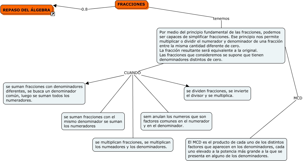 Este Cmap, tiene información relacionada con: FRACCIONES, Por medio del principio fundamental de las fracciones, podemos ser capaces de simplificar fracciones. Ese principio nos permite multiplicar o dividir el numerador y denominador de una fracción entre la misma cantidad diferente de cero. La fracción resultante será equivalente a la original. Las fracciones que consideremos se supone que tienen denominadores distintos de cero. CUANDO se dividen fracciones, se invierte el divisor y se multiplica., Por medio del principio fundamental de las fracciones, podemos ser capaces de simplificar fracciones. Ese principio nos permite multiplicar o dividir el numerador y denominador de una fracción entre la misma cantidad diferente de cero. La fracción resultante será equivalente a la original. Las fracciones que consideremos se supone que tienen denominadores distintos de cero. CUANDO sem anulan los numeros que son factores comunes en el numerador y en el denominador., Por medio del principio fundamental de las fracciones, podemos ser capaces de simplificar fracciones. Ese principio nos permite multiplicar o dividir el numerador y denominador de una fracción entre la misma cantidad diferente de cero. La fracción resultante será equivalente a la original. Las fracciones que consideremos se supone que tienen denominadores distintos de cero. MCD El MCD es el producto de cada uno de los distintos factores que aparecen en los denominadores, cada uno elevado a la potencia más grande a la que se presenta en alguno de los denominadores., FRACCIONES 0.8 REPASO DEL ÁLGEBRA, Por medio del principio fundamental de las fracciones, podemos ser capaces de simplificar fracciones. Ese principio nos permite multiplicar o dividir el numerador y denominador de una fracción entre la misma cantidad diferente de cero. La fracción resultante será equivalente a la original. Las fracciones que consideremos se supone que tienen denominadores distintos de cero. CUANDO se suman fracciones con el mismo denominador se suman los numeradores, Por medio del principio fundamental de las fracciones, podemos ser capaces de simplificar fracciones. Ese principio nos permite multiplicar o dividir el numerador y denominador de una fracción entre la misma cantidad diferente de cero. La fracción resultante será equivalente a la original. Las fracciones que consideremos se supone que tienen denominadores distintos de cero. CUANDO se multiplican fracciones, se multiplican los numeadores y los denominadores., FRACCIONES tenemos Por medio del principio fundamental de las fracciones, podemos ser capaces de simplificar fracciones. Ese principio nos permite multiplicar o dividir el numerador y denominador de una fracción entre la misma cantidad diferente de cero. La fracción resultante será equivalente a la original. Las fracciones que consideremos se supone que tienen denominadores distintos de cero., Por medio del principio fundamental de las fracciones, podemos ser capaces de simplificar fracciones. Ese principio nos permite multiplicar o dividir el numerador y denominador de una fracción entre la misma cantidad diferente de cero. La fracción resultante será equivalente a la original. Las fracciones que consideremos se supone que tienen denominadores distintos de cero. CUANDO se suman fracciones con denominadores diferentes, se busca un denominador común, luego se suman todos los numeradores.