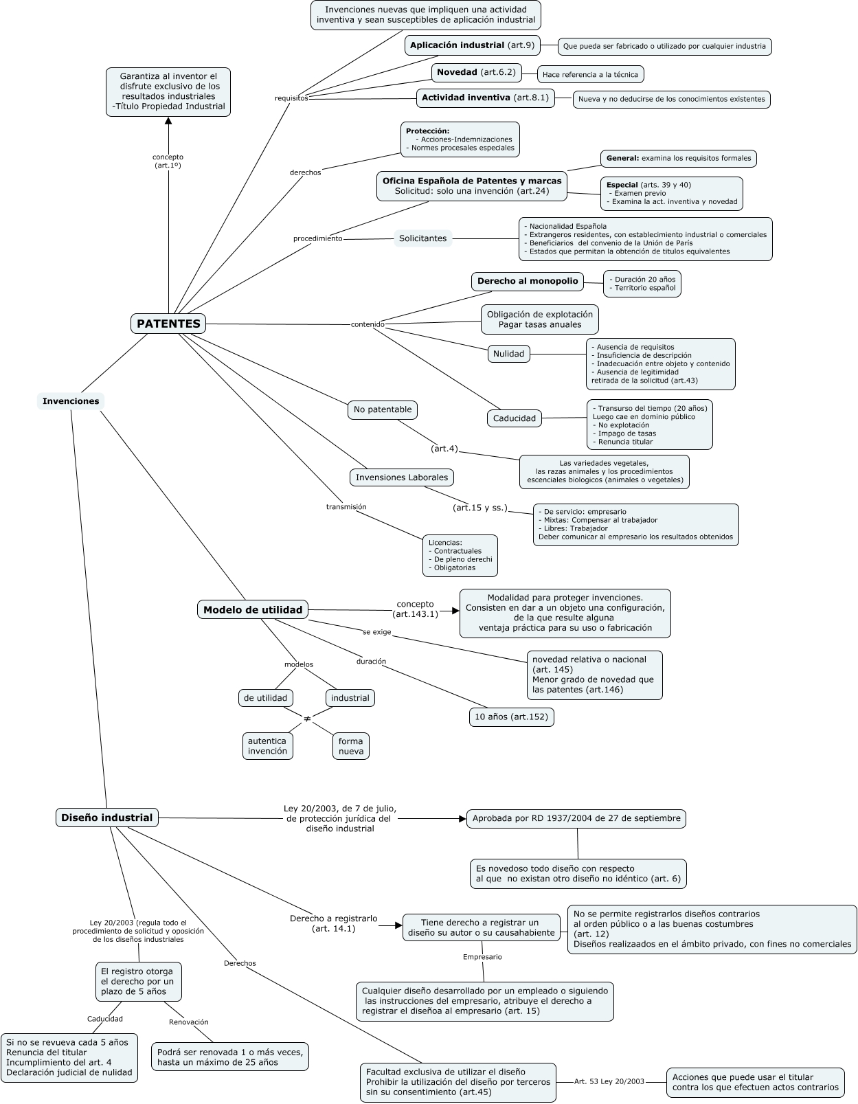 Este Cmap, tiene información relacionada con: patentes, PATENTES Invensiones Laborales, Caducidad ???? - Transurso del tiempo (20 años) Luego cae en dominio público - No explotación - Impago de tasas - Renuncia titular, Diseño industrial Ley 20/2003 (regula todo el procedimiento de solicitud y oposición de los diseños industriales El registro otorga el derecho por un plazo de 5 años, Solicitantes ???? - Nacionalidad Española - Extrangeros residentes, con establecimiento industrial o comerciales - Beneficiarios del convenio de la Unión de París - Estados que permitan la obtención de titulos equivalentes, El registro otorga el derecho por un plazo de 5 años Caducidad Si no se revueva cada 5 años Renuncia del titular Incumplimiento del art. 4 Declaración judicial de nulidad, Aplicación industrial (art.9) ???? Que pueda ser fabricado o utilizado por cualquier industria, Invensiones Laborales (art.15 y ss.) - De servicio: empresario - Mixtas: Compensar al trabajador - Libres: Trabajador Deber comunicar al empresario los resultados obtenidos, PATENTES requisitos Novedad (art.6.2), Modelo de utilidad modelos de utilidad, de utilidad ≠ industrial, PATENTES contenido Obligación de explotación Pagar tasas anuales, Invenciones ???? Diseño industrial, PATENTES requisitos Aplicación industrial (art.9), de utilidad ≠ autentica invención, No patentable (art.4) Las variedades vegetales, las razas animales y los procedimientos escenciales biologicos (animales o vegetales), Oficina Española de Patentes y marcas Solicitud: solo una invención (art.24) ???? Especial (arts. 39 y 40) - Examen previo - Examina la act. inventiva y novedad, Invenciones nuevas que impliquen una actividad inventiva y sean susceptibles de aplicación industrial requisitos Novedad (art.6.2), Invenciones ???? PATENTES, Modelo de utilidad se exige novedad relativa o nacional (art. 145) Menor grado de novedad que las patentes (art.146), Diseño industrial Ley 20/2003, de 7 de julio, de protección jurídica del diseño industrial Aprobada por RD 1937/2004 de 27 de septiembre