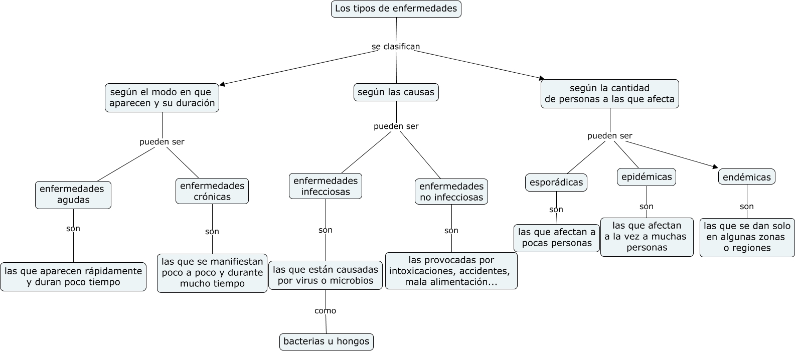 Este Cmap, tiene información relacionada con: Los tipos de enfermedades, epidémicas son las que afectan a la vez a muchas personas, Los tipos de enfermedades se clasifican según la cantidad de personas a las que afecta, esporádicas son las que afectan a pocas personas, según la cantidad de personas a las que afecta pueden ser epidémicas, según las causas pueden ser enfermedades infecciosas, según la cantidad de personas a las que afecta pueden ser esporádicas, enfermedades infecciosas son las que están causadas por virus o microbios, las que están causadas por virus o microbios como bacterias u hongos, según el modo en que aparecen y su duración pueden ser enfermedades agudas, según las causas pueden ser enfermedades no infecciosas, según el modo en que aparecen y su duración pueden ser enfermedades crónicas, endémicas son las que se dan solo en algunas zonas o regiones, enfermedades crónicas son las que se manifiestan poco a poco y durante mucho tiempo, enfermedades agudas son las que aparecen rápidamente y duran poco tiempo, enfermedades no infecciosas son las provocadas por intoxicaciones, accidentes, mala alimentación..., según la cantidad de personas a las que afecta pueden ser endémicas, Los tipos de enfermedades se clasifican según el modo en que aparecen y su duración, Los tipos de enfermedades se clasifican según las causas