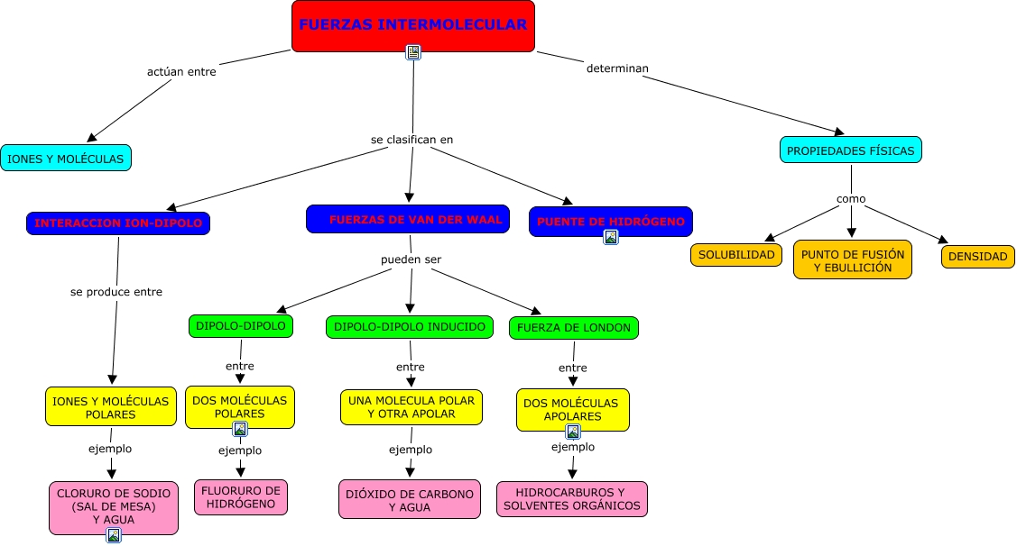 Este Cmap, tiene información relacionada con: Fuerzas intermoleculares, FUERZAS INTERMOLECULAR se clasifican en FUERZAS DE VAN DER WAAL, IONES Y MOLÉCULAS POLARES ejemplo CLORURO DE SODIO (SAL DE MESA) Y AGUA, FUERZAS INTERMOLECULAR se clasifican en PUENTE DE HIDRÓGENO, INTERACCION ION-DIPOLO se produce entre IONES Y MOLÉCULAS POLARES, FUERZAS DE VAN DER WAAL pueden ser DIPOLO-DIPOLO, DIPOLO-DIPOLO entre DOS MOLÉCULAS POLARES, FUERZAS INTERMOLECULAR se clasifican en INTERACCION ION-DIPOLO, FUERZA DE LONDON entre DOS MOLÉCULAS APOLARES, DOS MOLÉCULAS APOLARES ejemplo HIDROCARBUROS Y SOLVENTES ORGÁNICOS, PROPIEDADES FÍSICAS como DENSIDAD, FUERZAS DE VAN DER WAAL pueden ser FUERZA DE LONDON, FUERZAS DE VAN DER WAAL pueden ser DIPOLO-DIPOLO INDUCIDO, DOS MOLÉCULAS POLARES ejemplo FLUORURO DE HIDRÓGENO, PROPIEDADES FÍSICAS como SOLUBILIDAD, PROPIEDADES FÍSICAS como PUNTO DE FUSIÓN Y EBULLICIÓN, UNA MOLECULA POLAR Y OTRA APOLAR ejemplo DIÓXIDO DE CARBONO Y AGUA, DIPOLO-DIPOLO INDUCIDO entre UNA MOLECULA POLAR Y OTRA APOLAR, FUERZAS INTERMOLECULAR actúan entre IONES Y MOLÉCULAS, FUERZAS INTERMOLECULAR determinan PROPIEDADES FÍSICAS