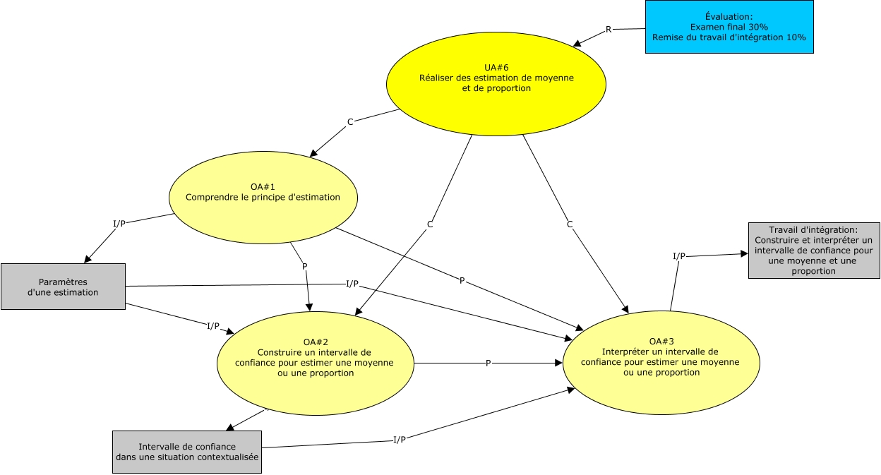 Cette carte de concepts créée avec IHMC CmapTools traite de: UA6, UA#6 Réaliser des estimation de moyenne et de proportion C OA#2 Construire un intervalle de confiance pour estimer une moyenne ou une proportion, OA#3 Interpréter un intervalle de confiance pour estimer une moyenne ou une proportion I/P Travail d'intégration: Construire et interpréter un intervalle de confiance pour une moyenne et une proportion, UA#6 Réaliser des estimation de moyenne et de proportion C OA#1 Comprendre le principe d'estimation, OA#1 Comprendre le principe d'estimation P OA#2 Construire un intervalle de confiance pour estimer une moyenne ou une proportion, OA#1 Comprendre le principe d'estimation P OA#3 Interpréter un intervalle de confiance pour estimer une moyenne ou une proportion, UA#6 Réaliser des estimation de moyenne et de proportion C OA#3 Interpréter un intervalle de confiance pour estimer une moyenne ou une proportion, Intervalle de confiance dans une situation contextualisée I/P OA#3 Interpréter un intervalle de confiance pour estimer une moyenne ou une proportion, Paramètres d'une estimation I/P OA#3 Interpréter un intervalle de confiance pour estimer une moyenne ou une proportion, Paramètres d'une estimation I/P OA#2 Construire un intervalle de confiance pour estimer une moyenne ou une proportion, Évaluation: Examen final 30% Remise du travail d'intégration 10% R UA#6 Réaliser des estimation de moyenne et de proportion, OA#1 Comprendre le principe d'estimation I/P Paramètres d'une estimation, OA#2 Construire un intervalle de confiance pour estimer une moyenne ou une proportion P OA#3 Interpréter un intervalle de confiance pour estimer une moyenne ou une proportion, OA#2 Construire un intervalle de confiance pour estimer une moyenne ou une proportion I/P Intervalle de confiance dans une situation contextualisée