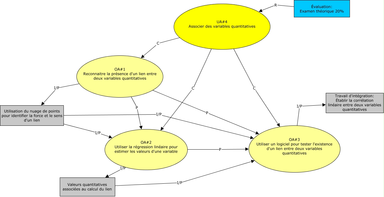 Cette carte de concepts créée avec IHMC CmapTools traite de: UA4, UA#4 Associer des variables quantitatives C OA#2 Utiliser la régression linéaire pour estimer les valeurs d'une variable, OA#3 Utiliser un logiciel pour tester l'existence d'un lien entre deux variables quantitatives I/P Travail d'intégration: Établir la corrélation linéaire entre deux variables quantitatives, UA#4 Associer des variables quantitatives C OA#1 Reconnaitre la présence d'un lien entre deux variables quantitatives, OA#1 Reconnaitre la présence d'un lien entre deux variables quantitatives P OA#3 Utiliser un logiciel pour tester l'existence d'un lien entre deux variables quantitatives, OA#1 Reconnaitre la présence d'un lien entre deux variables quantitatives P OA#2 Utiliser la régression linéaire pour estimer les valeurs d'une variable, Valeurs quantitatives associées au calcul du lien I/P OA#3 Utiliser un logiciel pour tester l'existence d'un lien entre deux variables quantitatives, UA#4 Associer des variables quantitatives C OA#3 Utiliser un logiciel pour tester l'existence d'un lien entre deux variables quantitatives, Utilisation du nuage de points pour identifier la force et le sens d'un lien I/P OA#3 Utiliser un logiciel pour tester l'existence d'un lien entre deux variables quantitatives, Évaluation: Examen théorique 20% R UA#4 Associer des variables quantitatives, OA#2 Utiliser la régression linéaire pour estimer les valeurs d'une variable P OA#3 Utiliser un logiciel pour tester l'existence d'un lien entre deux variables quantitatives, Utilisation du nuage de points pour identifier la force et le sens d'un lien I/P OA#2 Utiliser la régression linéaire pour estimer les valeurs d'une variable, OA#1 Reconnaitre la présence d'un lien entre deux variables quantitatives I/P Utilisation du nuage de points pour identifier la force et le sens d'un lien, OA#2 Utiliser la régression linéaire pour estimer les valeurs d'une variable I/P Valeurs quantitatives associées au calcul du lien