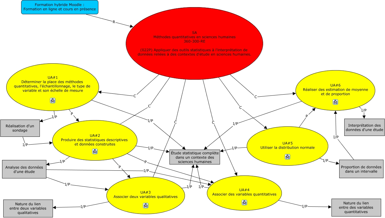 Cette carte de concepts créée avec IHMC CmapTools traite de: Cmap méthodes quantitatives, Formation hybride Moodle : Formation en ligne et cours en présence R SA Méthodes quantitatives en sciences humaines 360-300-RE (022P) Appliquer des outils statistiques à l'interprétation de données reliées à des contextes d'étude en sciences humaines., UA#2 Produire des statistiques descriptives et données construites I/P Étude statistique complète dans un contexte des sciences humaines, UA#4 Associer des variables quantitatives I/P Étude statistique complète dans un contexte des sciences humaines, UA#6 Réaliser des estimation de moyenne et de proportion I/P Étude statistique complète dans un contexte des sciences humaines, Proportion de données dans un intervalle I/P UA#6 Réaliser des estimation de moyenne et de proportion, SA Méthodes quantitatives en sciences humaines 360-300-RE (022P) Appliquer des outils statistiques à l'interprétation de données reliées à des contextes d'étude en sciences humaines. C UA#3 Associer deux variables qualitatives, SA Méthodes quantitatives en sciences humaines 360-300-RE (022P) Appliquer des outils statistiques à l'interprétation de données reliées à des contextes d'étude en sciences humaines. C UA#5 Utiliser la distribution normale, UA#4 Associer des variables quantitatives I/P Nature du lien entre des variables quantitatives, Réalisation d'un sondage I/P UA#2 Produire des statistiques descriptives et données construites, Analyse des données d'une étude I/P UA#4 Associer des variables quantitatives, UA#5 Utiliser la distribution normale I/P Proportion de données dans un intervalle, UA#1 Déterminer la place des méthodes quantitatives, l'échantillonnage, le type de variable et son échelle de mesure P UA#2 Produire des statistiques descriptives et données construites, UA#3 Associer deux variables qualitatives I/P Nature du lien entre deux variables qualitatives, UA#6 Réaliser des estimation de moyenne et de proportion I/P Interprétation des données d'une étude, UA#2 Produire des statistiques descriptives et données construites I/P Analyse des données d'une étude, UA#2 Produire des statistiques descriptives et données construites P UA#4 Associer des variables quantitatives, UA#1 Déterminer la place des méthodes quantitatives, l'échantillonnage, le type de variable et son échelle de mesure I/P Étude statistique complète dans un contexte des sciences humaines, UA#3 Associer deux variables qualitatives I/P Étude statistique complète dans un contexte des sciences humaines, SA Méthodes quantitatives en sciences humaines 360-300-RE (022P) Appliquer des outils statistiques à l'interprétation de données reliées à des contextes d'étude en sciences humaines. C UA#1 Déterminer la place des méthodes quantitatives, l'échantillonnage, le type de variable et son échelle de mesure, SA Méthodes quantitatives en sciences humaines 360-300-RE (022P) Appliquer des outils statistiques à l'interprétation de données reliées à des contextes d'étude en sciences humaines. C UA#2 Produire des statistiques descriptives et données construites