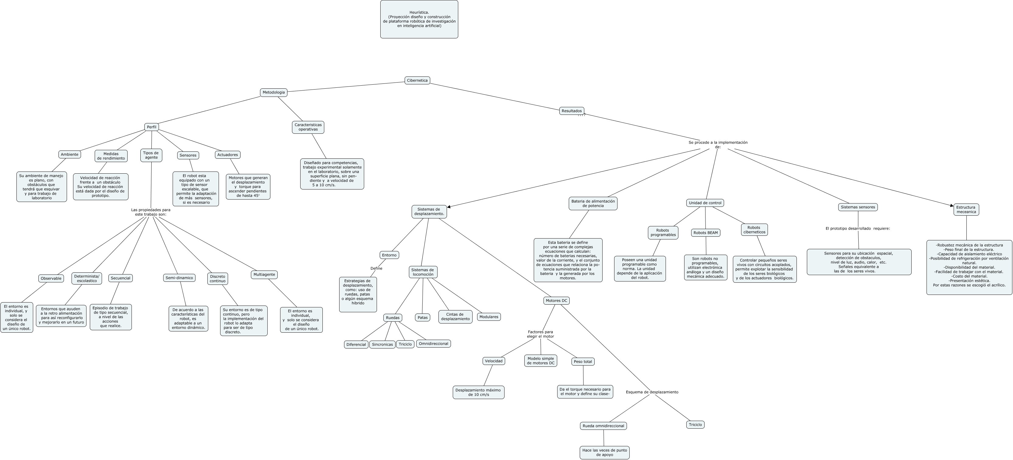 Este Cmap, tiene información relacionada con: Mapa. Heurística, Sistemas de locomoción ???? Ruedas, Bateria de alimentación de potencia ???? Esta bateria se define por una serie de complejas ecuaciones que calculan: número de baterias necesarias, valor de la corriente, y el conjunto de ecuaciones que relaciona la po- tencia suministrada por la bateria y la generada por los motores., Resultados Se procede a la implementación de: Sistemas de desplazamiento., Sistemas de desplazamiento. ???? Entorno, Multiagente ???? El entorno es individual, y solo se considera el diseño de un único robot., Unidad de control ???? Robots programables, Motores DC Factores para elegir el motor Peso total, Perfil ???? Medidas de rendimiento, Ruedas ???? Sincronicas, Tipos de agente Las propiedades para este trabajo son: Multiagente, Unidad de control ???? Robots ciberneticos, Ruedas ???? Diferencial, Ruedas ???? Triciclo, Entorno Define Estrategias de desplazamiento, como: uso de ruedas, patas o algún esquema hibrido, Robots BEAM ???? Son robots no programables, utilizan electrónica análoga y un diseño mecánica adecuado., Resultados Se procede a la implementación de: Bateria de alimentación de potencia, Motores DC Esquema de desplazamiento Rueda omnidireccional, Tipos de agente Las propiedades para este trabajo son: Semi-dinamico, Resultados Se procede a la implementación de: Sistemas sensores, Sistemas sensores El prototipo desarrollado requiere: Sensores para su ubicación espacial, detección de obstaculos, nivel de luz, audio, calor, etc. Señales equivalente a las de los seres vivos.