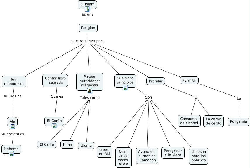 Este Cmap, tiene información relacionada con: El Islam, Religión se caracteriza por: Sus cinco principios, Poseer autoridades religiosas Tales como El Califa, Religión se caracteriza por: Permitir, Alá Su profeta es: Mahoma, Contar libro sagrado Que es El Corán, Sus cinco principios Son Ayuno en el mes de Ramadán, Ser monoteísta su Dios es: Alá, Religión se caracteriza por: Poseer autoridades religiosas, Religión se caracteriza por: Contar libro sagrado, Permitir La Poligamia, Religión se caracteriza por: Prohibir, Prohibir El La carne de cerdo, Sus cinco principios Son Orar cinco veces al día, Religión se caracteriza por: Ser monoteísta, Poseer autoridades religiosas Tales como Ulema, Sus cinco principios Son Peregrinar a la Meca, El Islam Es una Religión, Sus cinco principios Son Limosna para los pobr5es, Sus cinco principios Son creer en Alá, Prohibir El Consumo de alcohol