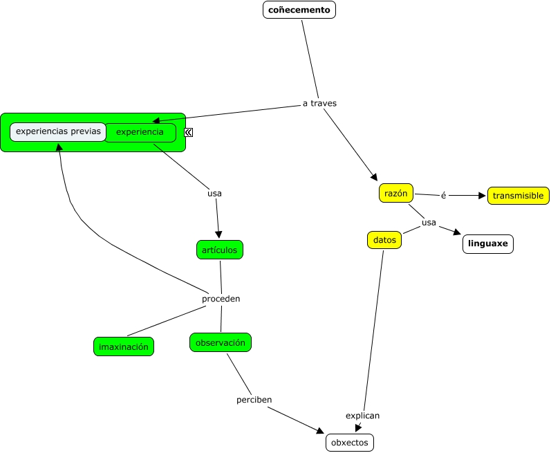 Este Cmap, tiene información relacionada con: mapa mio, artículos proceden observación, coñecemento a traves razón, artículos proceden imaxinación, razón usa linguaxe, razón é transmisible, artículos proceden experiencias previas, datos explican obxectos, coñecemento a traves experiencia, observación perciben obxectos, razón usa datos, experiencia usa artículos