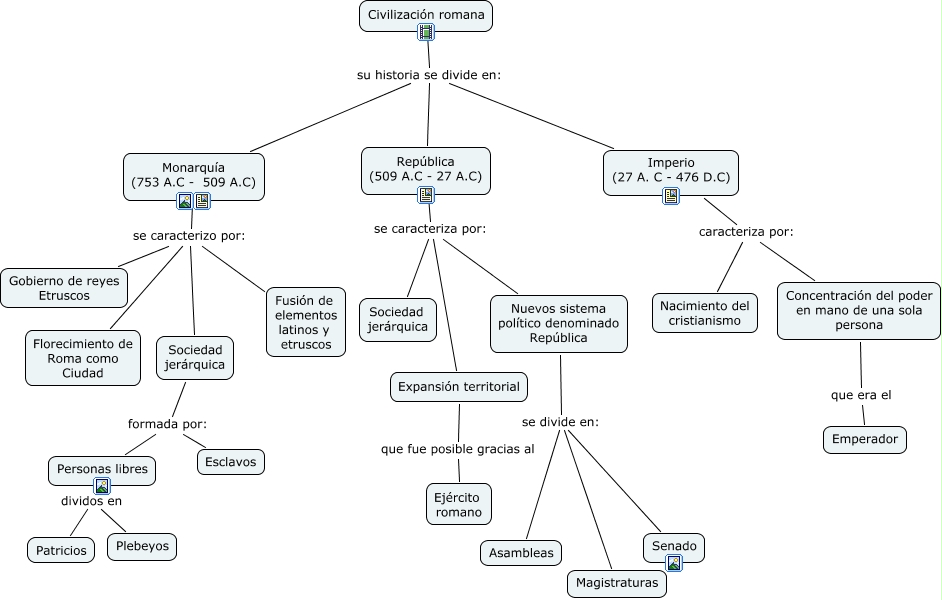 Este Cmap, tiene información relacionada con: Civilización romana, Sociedad jerárquica formada por: Personas libres, Imperio (27 A. C - 476 D.C) caracteriza por: Nacimiento del cristianismo, Monarquía (753 A.C - 509 A.C) se caracterizo por: Florecimiento de Roma como Ciudad, Imperio (27 A. C - 476 D.C) caracteriza por: Concentración del poder en mano de una sola persona, Expansión territorial que fue posible gracias al Ejército romano, Concentración del poder en mano de una sola persona que era el Emperador, República (509 A.C - 27 A.C) se caracteriza por: Sociedad jerárquica, República (509 A.C - 27 A.C) se caracteriza por: Nuevos sistema político denominado República, República (509 A.C - 27 A.C) se caracteriza por: Expansión territorial, Personas libres dividos en Patricios, Nuevos sistema político denominado República se divide en: Senado, Monarquía (753 A.C - 509 A.C) se caracterizo por: Sociedad jerárquica, Monarquía (753 A.C - 509 A.C) se caracterizo por: Gobierno de reyes Etruscos, Sociedad jerárquica formada por: Esclavos, Civilización romana su historia se divide en: República (509 A.C - 27 A.C), Nuevos sistema político denominado República se divide en: Asambleas, Nuevos sistema político denominado República se divide en: Magistraturas, Personas libres dividos en Plebeyos, Civilización romana su historia se divide en: Imperio (27 A. C - 476 D.C), Monarquía (753 A.C - 509 A.C) se caracterizo por: Fusión de elementos latinos y etruscos