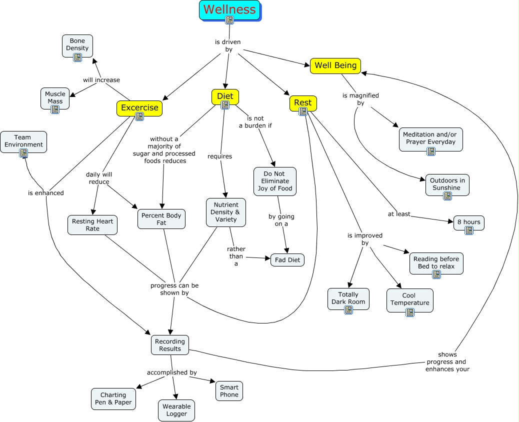 This Concept Map, created with IHMC CmapTools, has information related to: Wellness brainstorm, Diet is not a burden if Do Not Eliminate Joy of Food, Excercise will increase Muscle Mass, Excercise daily will reduce Percent Body Fat, Rest at least 8 hours, Nutrient Density & Variety progress can be shown by Recording Results, Excercise is enhanced Team Environment, Nutrient Density & Variety rather than a Fad Diet, Rest is improved by Totally Dark Room, Do Not Eliminate Joy of Food by going on a Fad Diet, Wellness is driven by Well Being, Recording Results shows progress and enhances your Well Being, Rest progress can be shown by Recording Results, Diet requires Nutrient Density & Variety, Rest is improved by Cool Temperature, Excercise is enhanced Recording Results, Excercise will increase Bone Density, Recording Results accomplished by Smart Phone, Recording Results accomplished by Wearable Logger, Wellness is driven by Diet, Resting Heart Rate progress can be shown by Recording Results