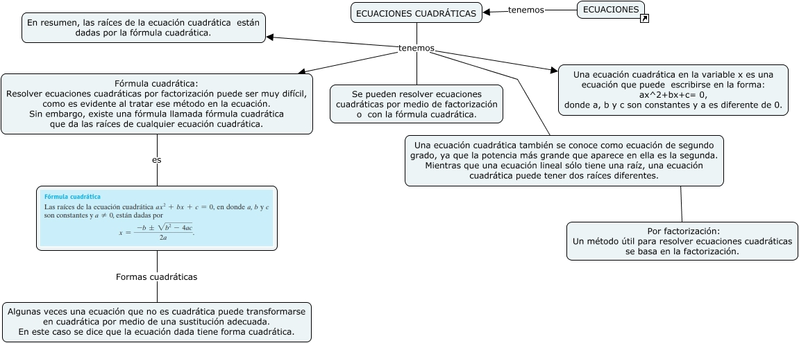 Este Cmap, tiene información relacionada con: ECUACIONES CUADRÁTICAS, ECUACIONES CUADRÁTICAS tenemos Fórmula cuadrática: Resolver ecuaciones cuadráticas por factorización puede ser muy difícil, como es evidente al tratar ese método en la ecuación. Sin embargo, existe una fórmula llamada fórmula cuadrática que da las raíces de cualquier ecuación cuadrática., Fórmula cuadrática: Resolver ecuaciones cuadráticas por factorización puede ser muy difícil, como es evidente al tratar ese método en la ecuación. Sin embargo, existe una fórmula llamada fórmula cuadrática que da las raíces de cualquier ecuación cuadrática. es, ECUACIONES CUADRÁTICAS tenemos Una ecuación cuadrática en la variable x es una ecuación que puede escribirse en la forma: ax^2+bx+c= 0, donde a, b y c son constantes y a es diferente de 0., Formas cuadráticas Algunas veces una ecuación que no es cuadrática puede transformarse en cuadrática por medio de una sustitución adecuada. En este caso se dice que la ecuación dada tiene forma cuadrática., ECUACIONES CUADRÁTICAS tenemos Se pueden resolver ecuaciones cuadráticas por medio de factorización o con la fórmula cuadrática., ECUACIONES CUADRÁTICAS tenemos Una ecuación cuadrática también se conoce como ecuación de segundo grado, ya que la potencia más grande que aparece en ella es la segunda. Mientras que una ecuación lineal sólo tiene una raíz, una ecuación cuadrática puede tener dos raíces diferentes., Una ecuación cuadrática también se conoce como ecuación de segundo grado, ya que la potencia más grande que aparece en ella es la segunda. Mientras que una ecuación lineal sólo tiene una raíz, una ecuación cuadrática puede tener dos raíces diferentes. Solución Por factorización: Un método útil para resolver ecuaciones cuadráticas se basa en la factorización., ECUACIONES CUADRÁTICAS tenemos En resumen, las raíces de la ecuación cuadrática están dadas por la fórmula cuadrática., ECUACIONES tenemos ECUACIONES CUADRÁTICAS