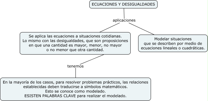 Este Cmap, tiene información relacionada con: ECUACIONES Y DESIGUALDADES, Se aplica las ecuaciones a situaciones cotidianas. Lo mismo con las desigualdades, que son proposiciones en que una cantidad es mayor, menor, no mayor o no menor que otra cantidad. tenemos En la mayoría de los casos, para resolver problemas prácticos, las relaciones establecidas deben traducirse a símbolos matemáticos. Esto se conoce como modelado. ESISTEN PALABRAS CLAVE para realizar el modelado., ECUACIONES Y DESIGUALDADES aplicaciones Modelar situaciones que se describen por medio de ecuaciones lineales o cuadráticas., ECUACIONES Y DESIGUALDADES aplicaciones Se aplica las ecuaciones a situaciones cotidianas. Lo mismo con las desigualdades, que son proposiciones en que una cantidad es mayor, menor, no mayor o no menor que otra cantidad.