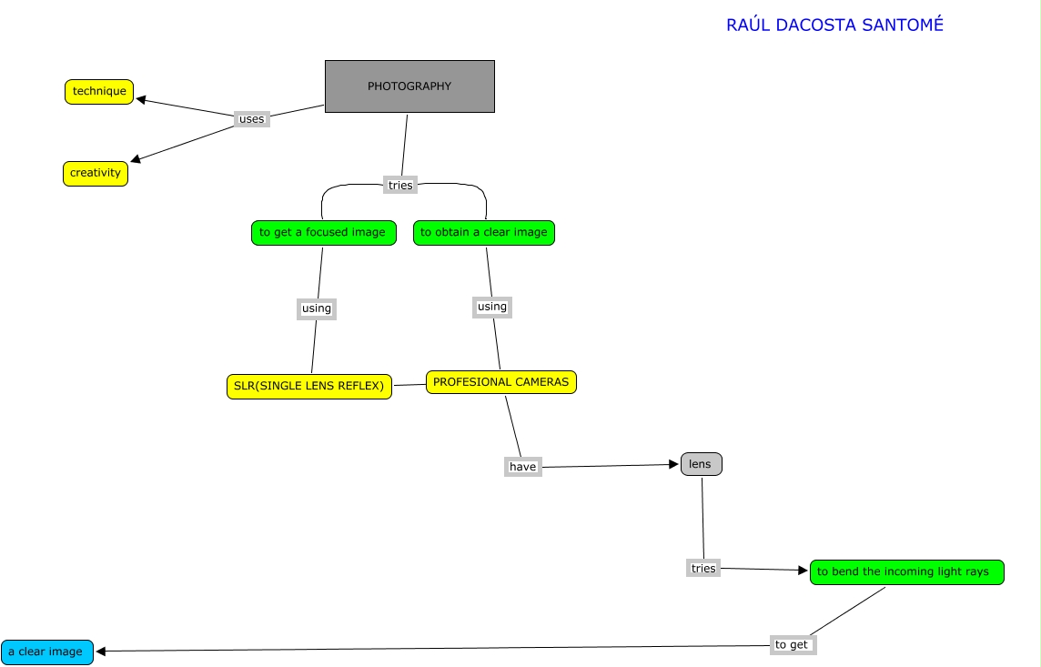 Este Cmap, tiene información relacionada con: cam,eras, PHOTOGRAPHY tries to obtain a clear image, PROFESIONAL CAMERAS have lens, PHOTOGRAPHY uses creativity, to obtain a clear image using PROFESIONAL CAMERAS, PHOTOGRAPHY tries to get a focused image, lens tries to bend the incoming light rays, to get a focused image using SLR(SINGLE LENS REFLEX), SLR(SINGLE LENS REFLEX) ???? PROFESIONAL CAMERAS, PHOTOGRAPHY uses technique, to bend the incoming light rays to get a clear image