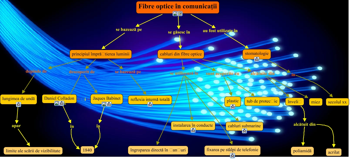 This Concept Map, created with IHMC CmapTools, has information related to: Fibre optice în comunicații, Fibre optice în comunicaţii se găsesc în cabluri din fibre optice, Daniel Colladon și Jaques Babinet, Fibre optice în comunicaţii au fost utilizate în stomatologie, cabluri din fibre optice alcătuite din înveliș, cabluri din fibre optice se utilizează la cabluri submarine, principiul împrăștierea luminii descoperit de Jaques Babinet, Daniel Colladon în 1840, principiul împrăștierea luminii se bazează pe reflexia internă totală, Fibre optice în comunicaţii se bazează pe principiul împrăștierea luminii, cabluri din fibre optice sunt acoperite cu tub de protecție, cabluri din fibre optice alcătuite din miez, cabluri din fibre optice se utilizează la instalarea în conducte, înveliș alcătuit din poliamidă, cabluri din fibre optice se utilizează la îngroparea directă în șanțuri, principiul împrăștierea luminii descoperit de Daniel Colladon, cabluri din fibre optice sunt acoperite cu plastic, cabluri din fibre optice se utilizează la fixarea pe stâlpi de telefonie, Jaques Babinet în 1840, înveliș alcătuit din acrilat, lungimea de undă apar limite ale scării de vizibilitate
