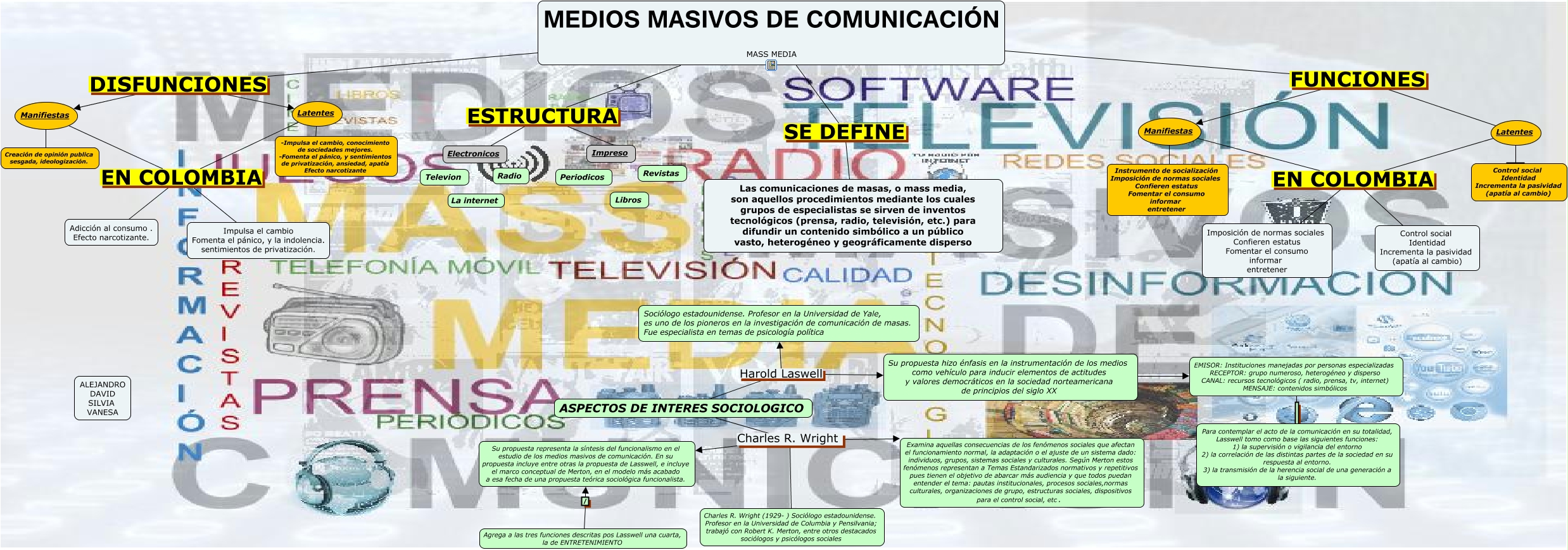 Este Cmap, tiene información relacionada con: massmedia, Manifiestas EN COLOMBIA Imposición de normas sociales Confieren estatus Fomentar el consumo informar entretener, MEDIOS MASIVOS DE COMUNICACIÓN MASS MEDIA DISFUNCIONES Manifiestas, ASPECTOS DE INTERES SOCIOLOGICO Charles R. Wright Charles R. Wright (1929- ) Sociólogo estadounidense. Profesor en la Universidad de Columbia y Pensilvania; trabajó con Robert K. Merton, entre otros destacados sociólogos y psicólogos sociales, MEDIOS MASIVOS DE COMUNICACIÓN MASS MEDIA ESTRUCTURA Electronicos, ASPECTOS DE INTERES SOCIOLOGICO Harold Laswell Sociólogo estadounidense. Profesor en la Universidad de Yale, es uno de los pioneros en la investigación de comunicación de masas. Fue especialista en temas de psicología política, MEDIOS MASIVOS DE COMUNICACIÓN MASS MEDIA SE DEFINE Las comunicaciones de masas, o mass media, son aquellos procedimientos mediante los cuales grupos de especialistas se sirven de inventos tecnológicos (prensa, radio, televisión, etc.) para difundir un contenido simbólico a un público vasto, heterogéneo y geográficamente disperso, Manifiestas EN COLOMBIA Adicción al consumo . Efecto narcotizante., Latentes ???? -Impulsa el cambio, conocimiento de sociedades mejores. -Fomenta el pánico, y sentimientos de privatización, ansiedad, apatía Efecto narcotizante, Manifiestas ???? Creación de opinión publica sesgada, ideologización., MEDIOS MASIVOS DE COMUNICACIÓN MASS MEDIA DISFUNCIONES Latentes, Latentes EN COLOMBIA Control social Identidad Incrementa la pasividad (apatía al cambio), ASPECTOS DE INTERES SOCIOLOGICO Charles R. Wright Su propuesta representa la síntesis del funcionalismo en el estudio de los medios masivos de comunicación. En su propuesta incluye entre otras la propuesta de Lasswell, e incluye el marco conceptual de Merton, en el modelo más acabado a esa fecha de una propuesta teórica sociológica funcionalista., Manifiestas ???? Instrumento de socialización Imposición de normas sociales Confieren estatus Fomentar el consumo informar entretener, MEDIOS MASIVOS DE COMUNICACIÓN MASS MEDIA FUNCIONES Latentes, EMISOR: Instituciones manejadas por personas especializadas RECEPTOR: grupo numeroso, heterogéneo y disperso CANAL: recursos tecnológicos ( radio, prensa, tv, internet) MENSAJE: contenidos simbólicos Para contemplar el acto de la comunicación en su totalidad, Lasswell tomo como base las siguientes funciones: 1) la supervisión o vigilancia del entorno 2) la correlación de las distintas partes de la sociedad en su respuesta al entorno. 3) la transmisión de la herencia social de una generación a la siguiente., Manifiestas EN COLOMBIA Impulsa el cambio Fomenta el pánico, y la indolencia. sentimientos de privatización., Latentes EN COLOMBIA Imposición de normas sociales Confieren estatus Fomentar el consumo informar entretener, Latentes EN COLOMBIA Adicción al consumo . Efecto narcotizante., MEDIOS MASIVOS DE COMUNICACIÓN MASS MEDIA ESTRUCTURA Impreso, Agrega a las tres funciones descritas pos Lasswell una cuarta, la de ENTRETENIMIENTO / Su propuesta representa la síntesis del funcionalismo en el estudio de los medios masivos de comunicación. En su propuesta incluye entre otras la propuesta de Lasswell, e incluye el marco conceptual de Merton, en el modelo más acabado a esa fecha de una propuesta teórica sociológica funcionalista.
