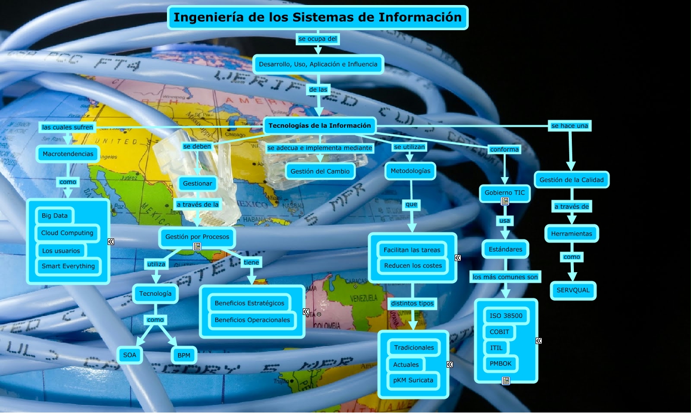 Este Cmap, tiene información relacionada con: ISI, Gobierno TIC usa Estándares, Tecnologías de la Información se deben Gestionar, Tecnologías de la Información conforma Gobierno TIC, Estándares los más comunes son ????, Gestión por Procesos utiliza Tecnología, Gestión por Procesos tiene ????, Tecnologías de la Información se utilizan Metodologías, Gestión de la Calidad a través de Herramientas, Tecnología como BPM, Desarrollo, Uso, Aplicación e Influencia de las Tecnologías de la Información, Macrotendencias como ????, Ingeniería de los Sistemas de Información se ocupa del Desarrollo, Uso, Aplicación e Influencia, Metodologías que ????, Tecnología como SOA, Tecnologías de la Información las cuales sufren Macrotendencias, Gestionar a través de la Gestión por Procesos, Herramientas como SERVQUAL, Tecnologías de la Información se adecua e implementa mediante Gestión del Cambio, ???? distintos tipos ????, Tecnologías de la Información se hace una Gestión de la Calidad