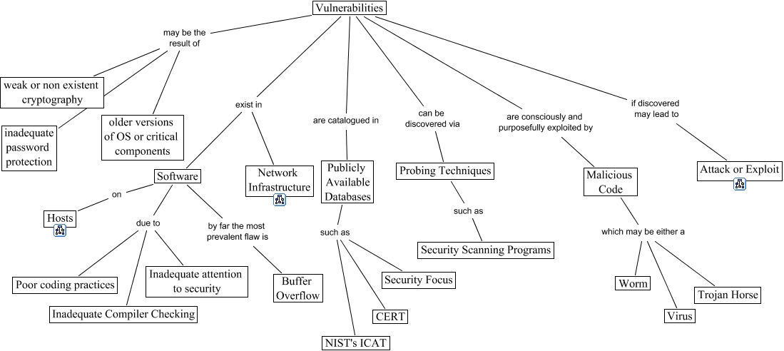 Cette carte de concepts créée avec IHMC CmapTools traite de: Vulnerabilities, Software due to Poor coding practices, Malicious Code which may be either a Worm, Publicly Available Databases such as NIST's ICAT, Software by far the most prevalent flaw is Buffer Overflow, Publicly Available Databases such as CERT, Vulnerabilities may be the result of older versions of OS or critical components, Software on Hosts, Publicly Available Databases such as Security Focus, Probing Techniques such as Security Scanning Programs, Vulnerabilities may be the result of inadequate password protection, Software due to Inadequate Compiler Checking, Vulnerabilities are catalogued in Publicly Available Databases, Vulnerabilities if discovered may lead to Attack or Exploit, Vulnerabilities are consciously and purposefully exploited by Malicious Code, Software due to Inadequate attention to security, Vulnerabilities exist in Network Infrastructure, Vulnerabilities can be discovered via Probing Techniques, Vulnerabilities may be the result of weak or non existent cryptography, Malicious Code which may be either a Virus, Vulnerabilities exist in Software