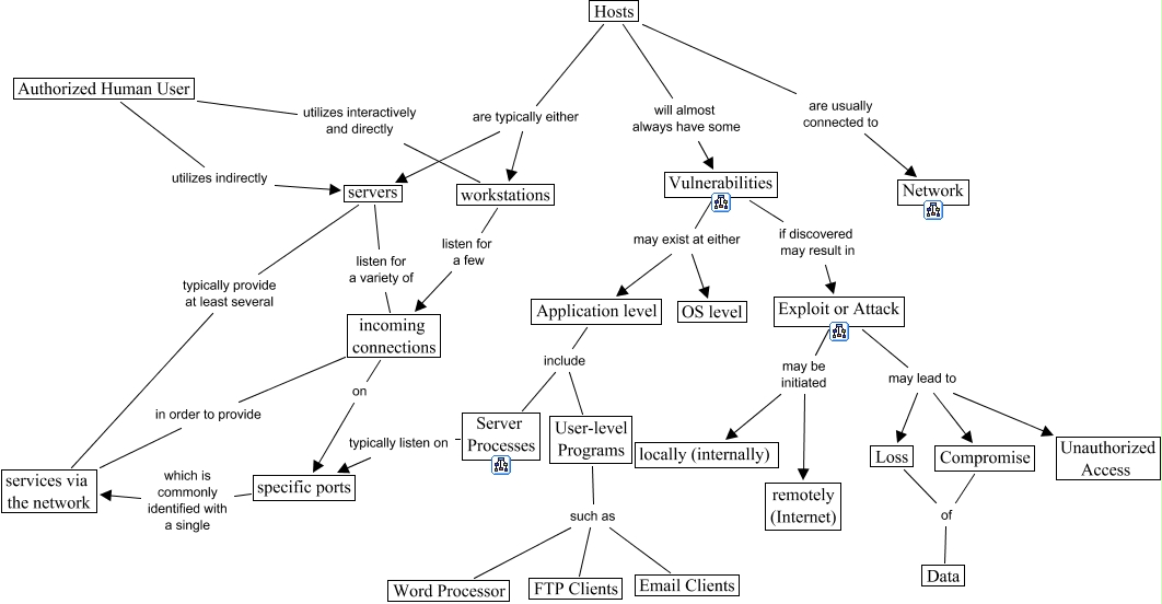 Cette carte de concepts créée avec IHMC CmapTools traite de: Hosts, Exploit or Attack may be initiated remotely (Internet), Application level include User-level Programs, Hosts will almost always have some Vulnerabilities, Application level include Server Processes, Hosts are typically either servers, User-level Programs such as Email Clients, servers typically provide at least several services via the network, Loss of Data, Exploit or Attack may be initiated locally (internally), Exploit or Attack may lead to Loss, workstations listen for a few incoming connections, Authorized Human User utilizes indirectly servers, servers listen for a variety of incoming connections, Hosts are typically either workstations, Vulnerabilities may exist at either OS level, specific ports which is commonly identified with a single services via the network, Server Processes typically listen on specific ports, Vulnerabilities may exist at either Application level, Authorized Human User utilizes interactively and directly workstations, incoming connections in order to provide services via the network