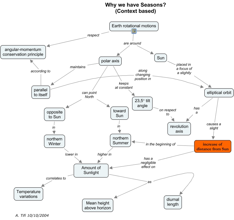 Cette carte de concepts créée avec IHMC CmapTools traite de: Seasons context based, Sun placed in a focus of a slightly elliptical orbit, increase of distance from Sun has a negligible effect on Amount of Sunlight, parallel to itself along changing position in elliptical orbit, northern Winter lower in Amount of Sunlight, Amount of Sunlight as Mean height above horizon, increase of distance from Sun in the beginning of northern Summer, polar axis can point North opposite to Sun, northern Summer higher in Amount of Sunlight, Amount of Sunlight correlates to Temperature variations, elliptical orbit has a revolution axis, Earth rotational motions respect angular-momentum conservation principle, polar axis can point North toward Sun, 23,5° tilt angle on respect to revolution axis, Amount of Sunlight as diurnal length, elliptical orbit causes a slight increase of distance from Sun, parallel to itself according to angular-momentum conservation principle, Earth rotational motions are around Sun, polar axis keeps at constant 23,5° tilt angle, Earth rotational motions are around polar axis, toward Sun in northern Summer