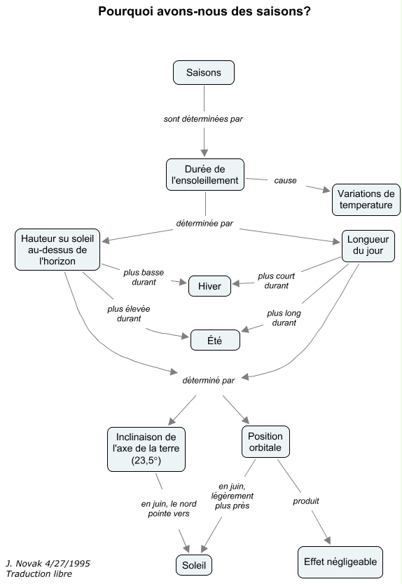 Cette carte de concepts créée avec IHMC CmapTools traite de: Saisons01, Hauteur su soleil au-dessus de l'horizon plus élevée durant Été, Longueur du jour plus court durant Hiver, Hauteur su soleil au-dessus de l'horizon plus basse durant Hiver, Saisons sont déterminées par Durée de l'ensoleillement, Hauteur su soleil au-dessus de l'horizon déterminé par Position orbitale, Inclinaison de l'axe de la terre (23,5°) en juin, le nord pointe vers Soleil, Longueur du jour déterminé par Position orbitale, Position orbitale produit Effet négligeable, Durée de l'ensoleillement cause Variations de temperature, Durée de l'ensoleillement déterminée par Longueur du jour, Position orbitale en juin, légèrement plus près Soleil, Longueur du jour plus long durant Été, Longueur du jour déterminé par Inclinaison de l'axe de la terre (23,5°), Durée de l'ensoleillement déterminée par Hauteur su soleil au-dessus de l'horizon, Hauteur su soleil au-dessus de l'horizon déterminé par Inclinaison de l'axe de la terre (23,5°)