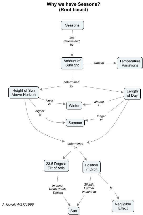 Cette carte de concepts créée avec IHMC CmapTools traite de: Seasons root based, Height of Sun Above Horizon determined by 23.5 Degree Tilt of Axis, Position in Orbit Slightly Further in June to Sun, Height of Sun Above Horizon lower in Winter, Length of Day shorter in Winter, Position in Orbit is Negligible Effect, Height of Sun Above Horizon higher in Summer, 23.5 Degree Tilt of Axis In June, North Points Toward Sun, Amount of Sunlight determined by Length of Day, Length of Day longer in Summer, Seasons are determined by Amount of Sunlight, Length of Day determined by 23.5 Degree Tilt of Axis, Amount of Sunlight determined by Height of Sun Above Horizon, Height of Sun Above Horizon determined by Position in Orbit, Amount of Sunlight causes Temperature Variations, Length of Day determined by Position in Orbit