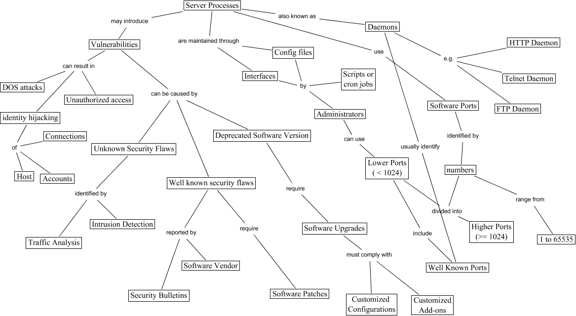 Cette carte de concepts créée avec IHMC CmapTools traite de: Server Processes, Server Processes may introduce Vulnerabilities, Well known security flaws reported by Software Vendor, Config files by Scripts or cron jobs, Lower Ports ( < 1024) divided into Higher Ports (>= 1024), Server Processes also known as Daemons, Vulnerabilities can be caused by Deprecated Software Version, identity hijacking of Connections, Software Upgrades must comply with Customized Add-ons, Software Ports identified by numbers, Config files by Administrators, Vulnerabilities can be caused by Unknown Security Flaws, Software Upgrades must comply with Customized Configurations, Server Processes are maintained through Config files, Well Known Ports usually identify Daemons, Deprecated Software Version require Software Upgrades, Server Processes use Software Ports, Daemons e.g. FTP Daemon, Unknown Security Flaws identified by Traffic Analysis, Daemons e.g. Telnet Daemon, numbers range from 1 to 65535
