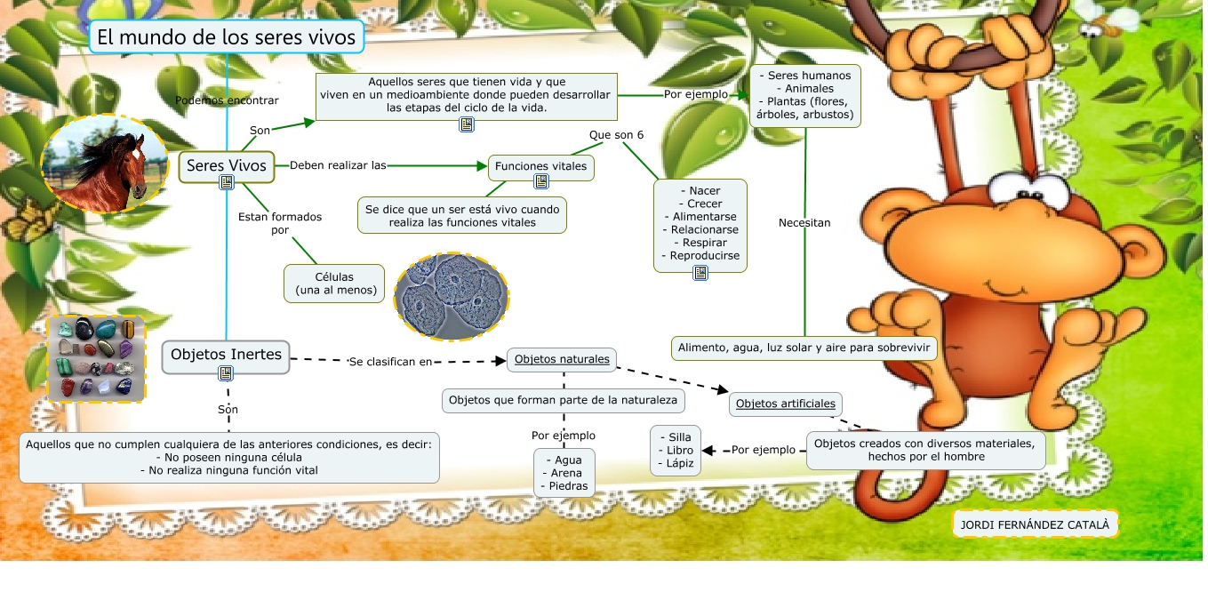 Este Cmap, tiene información relacionada con: El mundo de los seres vivos, Aquellos seres que tienen vida y que viven en un medioambiente donde pueden desarrollar las etapas del ciclo de la vida. Por ejemplo - Seres humanos - Animales - Plantas (flores, árboles, arbustos), Objetos Inertes Son Aquellos que no cumplen cualquiera de las anteriores condiciones, es decir: - No poseen ninguna célula - No realiza ninguna función vital, Funciones vitales ???? Se dice que un ser está vivo cuando realiza las funciones vitales, Seres Vivos Estan formados por Células (una al menos), Seres Vivos Son Aquellos seres que tienen vida y que viven en un medioambiente donde pueden desarrollar las etapas del ciclo de la vida., Objetos creados con diversos materiales, hechos por el hombre Por ejemplo - Silla - Libro - Lápiz, Objetos que forman parte de la naturaleza Por ejemplo - Agua - Arena - Piedras, El mundo de los seres vivos Podemos encontrar Objetos Inertes, Objetos naturales ???? Objetos que forman parte de la naturaleza, Funciones vitales Que son 6 - Nacer - Crecer - Alimentarse - Relacionarse - Respirar - Reproducirse, Objetos Inertes Se clasifican en Objetos naturales, Objetos artificiales ???? Objetos creados con diversos materiales, hechos por el hombre, - Seres humanos - Animales - Plantas (flores, árboles, arbustos) Necesitan Alimento, agua, luz solar y aire para sobrevivir, Seres Vivos Deben realizar las Funciones vitales, Objetos naturales ???? Objetos artificiales