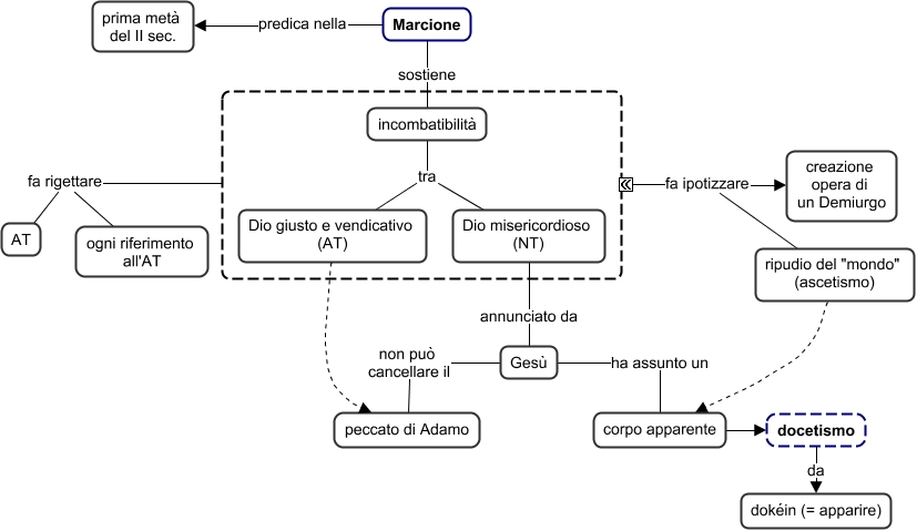 Questa Cmap, creata con IHMC CmapTools, contiene informazioni relative a: x02 Marcione, incombatibilità tra Dio misericordioso (NT), ???? fa ipotizzare ripudio del "mondo" (ascetismo), docetismo da dokéin (= apparire), incombatibilità tra Dio giusto e vendicativo (AT), Marcione predica nella prima metà del II sec., ???? fa rigettare AT, ???? fa ipotizzare creazione opera di un Demiurgo, Gesù ha assunto un corpo apparente, ripudio del "mondo" (ascetismo) corpo apparente, Marcione sostiene incombatibilità, Dio misericordioso (NT) annunciato da Gesù, corpo apparente docetismo, Dio giusto e vendicativo (AT) peccato di Adamo, ???? fa rigettare ogni riferimento all'AT, Gesù non può cancellare il peccato di Adamo