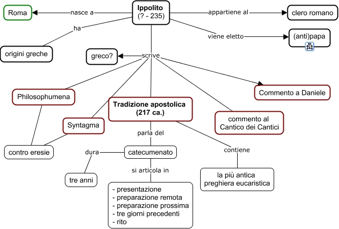 Questa Cmap, creata con IHMC CmapTools, contiene informazioni relative a: 45 Ippolito romano, Ippolito (? - 235) scrive greco?, catecumenato dura tre anni, Ippolito (? - 235) scrive Commento a Daniele, Ippolito (? - 235) scrive Philosophumena, Ippolito (? - 235) nasce a Roma, Ippolito (? - 235) viene eletto (anti)papa, Ippolito (? - 235) ha origini greche, Ippolito (? - 235) appartiene al clero romano, Philosophumena contro eresie, Ippolito (? - 235) scrive Tradizione apostolica (217 ca.), Ippolito (? - 235) scrive commento al Cantico dei Cantici, Tradizione apostolica (217 ca.) parla del catecumenato, Tradizione apostolica (217 ca.) contiene la più antica preghiera eucaristica, catecumenato si articola in - presentazione - preparazione remota - preparazione prossima - tre giorni precedenti - rito, Syntagma contro eresie, Ippolito (? - 235) scrive Syntagma