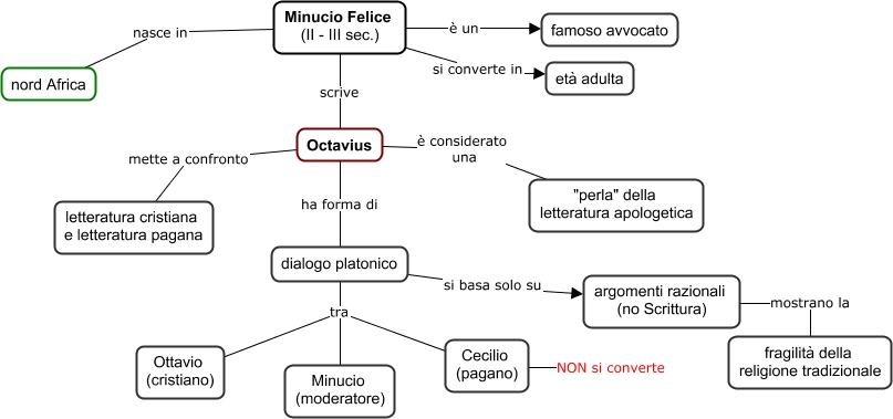 Questa Cmap, creata con IHMC CmapTools, contiene informazioni relative a: 46 Minucio Felice, Octavius ha forma di dialogo platonico, dialogo platonico si basa solo su argomenti razionali (no Scrittura), Minucio Felice (II - III sec.) si converte in età adulta, dialogo platonico tra Ottavio (cristiano), Minucio Felice (II - III sec.) è un famoso avvocato, dialogo platonico tra Cecilio (pagano), argomenti razionali (no Scrittura) mostrano la fragilità della religione tradizionale, dialogo platonico tra Minucio (moderatore), Octavius è considerato una "perla" della letteratura apologetica, Minucio Felice (II - III sec.) scrive Octavius, Minucio Felice (II - III sec.) nasce in nord Africa, Octavius mette a confronto letteratura cristiana e letteratura pagana