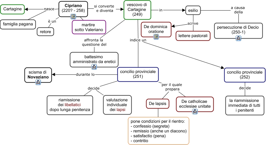 Questa Cmap, creata con IHMC CmapTools, contiene informazioni relative a: 47 Cipriano, esilio a causa della persecuzione di Decio (250-1), vescovo di Cartagine (249) indice un concilio provinciale (251), vescovo di Cartagine (249) in esilio, concilio provinciale (251) durante lo scisma di Novaziano, Cipriano (220? - 258) martire sotto Valeriano, esilio scrive lettere pastorali, Cipriano (220? - 258) nasce famiglia pagana, Cipriano (220? - 258) è un retore, vescovo di Cartagine (249) affronta la questione del battesimo amministrato da eretici, concilio provinciale (251) decide valutazione individuale dei lapsi, esilio scrive De dominica oratione, concilio provinciale (252) decide la riammissione immediata di tutti i penitenti, De lapsis pone condizioni per il rientro: - confessio (segreta) - remissio (anche un diacono) - satisfactio (pena) - contritio, concilio provinciale (251) per il quale prepara De catholicae ecclesiae unitate, concilio provinciale (251) decide riamissione dei libellatici dopo lunga penitenza, Cipriano (220? - 258) si converte e diventa vescovo di Cartagine (249), concilio provinciale (251) per il quale prepara De lapsis, vescovo di Cartagine (249) indice un concilio provinciale (252), Cipriano (220? - 258) nasce Cartagine