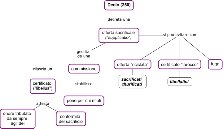 Questa Cmap, creata con IHMC CmapTools, contiene informazioni relative a: z01 Persecuzione di Decio, commissione rilascia un certificato ("libellus"), certificato ("libellus") attesta conformità del sacrificio, offerta sacrificale ("supplicatio") gestita da una commissione, Decio (250) decreta una offerta sacrificale ("supplicatio"), offerta sacrificale ("supplicatio") si può evitare con certificato "tarocco", offerta "riciclata" sacrificati thurificati, offerta sacrificale ("supplicatio") si può evitare con fuga, commissione stabilisce pene per chi rifiuti, certificato ("libellus") attesta onore tributato da sempre agli dei, offerta sacrificale ("supplicatio") si può evitare con offerta "riciclata", certificato "tarocco" libellatici