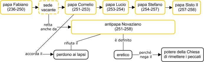Questa Cmap, creata con IHMC CmapTools, contiene informazioni relative a: y01 antipapa Novaziano, eretico perché nega il potere della Chiesa di rimettere i peccati, papa Stefano (254-257) papa Sisto II (257-258), antipapa Novaziano (251-258) rifiuta il perdono ai lapsi, papa Lucio (253-254) papa Stefano (254-257), antipapa Novaziano (251-258) è definito eretico, papa Cornelio (251-253) accorda il perdono ai lapsi, papa Fabiano (236-250) sede vacante, sede vacante papa Cornelio (251-253), papa Cornelio (251-253) papa Lucio (253-254), sede vacante retta anche da antipapa Novaziano (251-258)