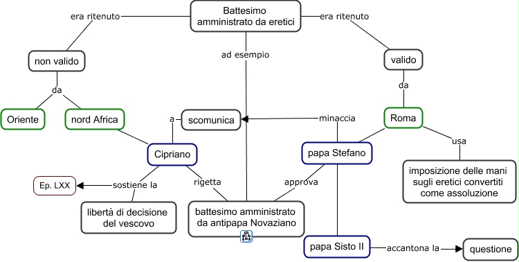 Questa Cmap, creata con IHMC CmapTools, contiene informazioni relative a: x04 Battesimo degli eretici, Battesimo amministrato da eretici era ritenuto non valido, Battesimo amministrato da eretici ad esempio battesimo amministrato da antipapa Novaziano, valido da Roma, papa Stefano approva battesimo amministrato da antipapa Novaziano, scomunica a Cipriano, papa Sisto II accantona la questione, Cipriano rigetta battesimo amministrato da antipapa Novaziano, non valido da Oriente, Battesimo amministrato da eretici era ritenuto valido, non valido da nord Africa, Roma usa imposizione delle mani sugli eretici convertiti come assoluzione, nord Africa Cipriano, Cipriano sostiene la libertà di decisione del vescovo, Roma papa Stefano, papa Stefano papa Sisto II, papa Stefano minaccia scomunica, Cipriano sostiene la Ep. LXX