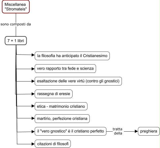 Questa Cmap, creata con IHMC CmapTools, contiene informazioni relative a: 51 Clemente di Alessandria - Stromateis, il "vero gnostico" è il cristiano perfetto tratta della preghiera, Miscellanea "Stromateis" sono composti da 7 + 1 libri, 7 + 1 libri martirio, perfezione cristiana, 7 + 1 libri vero rapporto tra fede e scienza, 7 + 1 libri citazioni di filosofi, 7 + 1 libri etica - matrimonio cristiano, 7 + 1 libri rassegna di eresie, 7 + 1 libri la filosofia ha anticipato il Cristianesimo, 7 + 1 libri esaltazione delle vere virtù (contro gli gnostici), 7 + 1 libri il "vero gnostico" è il cristiano perfetto