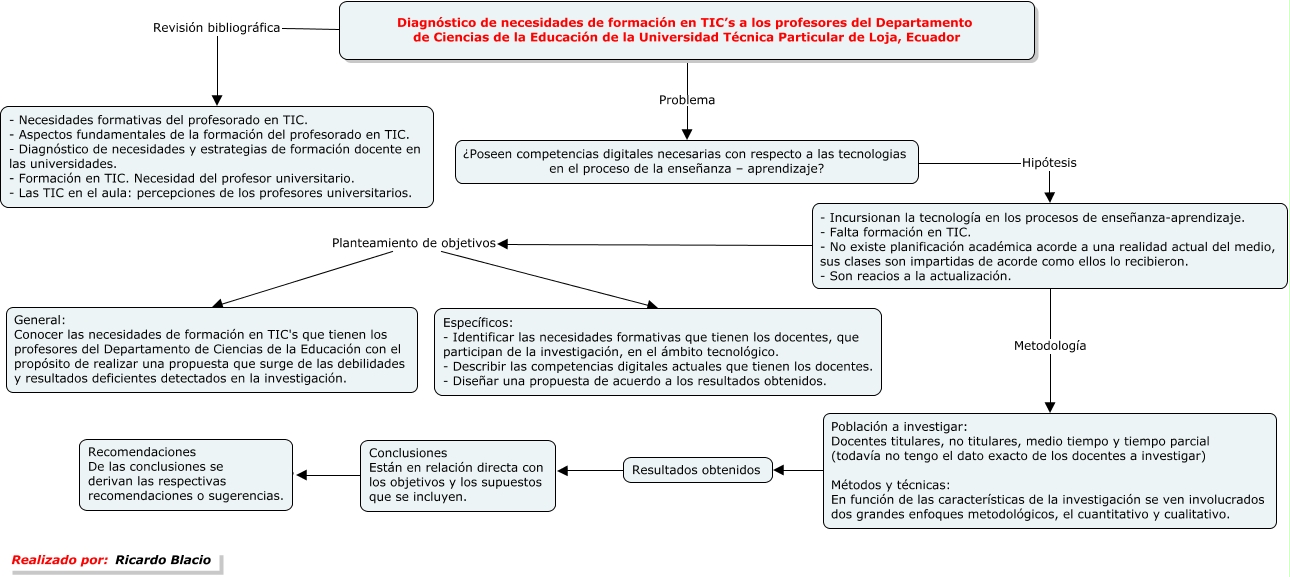 Este Cmap, tiene información relacionada con: Actividad 1.2, ¿Poseen competencias digitales necesarias con respecto a las tecnologias en el proceso de la enseñanza – aprendizaje? Hipótesis - Incursionan la tecnología en los procesos de enseñanza-aprendizaje. - Falta formación en TIC. - No existe planificación académica acorde a una realidad actual del medio, sus clases son impartidas de acorde como ellos lo recibieron. - Son reacios a la actualización., Diagnóstico de necesidades de formación en TIC’s a los profesores del Departamento de Ciencias de la Educación de la Universidad Técnica Particular de Loja, Ecuador Problema ¿Poseen competencias digitales necesarias con respecto a las tecnologias en el proceso de la enseñanza – aprendizaje?, - Incursionan la tecnología en los procesos de enseñanza-aprendizaje. - Falta formación en TIC. - No existe planificación académica acorde a una realidad actual del medio, sus clases son impartidas de acorde como ellos lo recibieron. - Son reacios a la actualización. Planteamiento de objetivos Específicos: - Identificar las necesidades formativas que tienen los docentes, que participan de la investigación, en el ámbito tecnológico. - Describir las competencias digitales actuales que tienen los docentes. - Diseñar una propuesta de acuerdo a los resultados obtenidos., - Incursionan la tecnología en los procesos de enseñanza-aprendizaje. - Falta formación en TIC. - No existe planificación académica acorde a una realidad actual del medio, sus clases son impartidas de acorde como ellos lo recibieron. - Son reacios a la actualización. Metodología Población a investigar: Docentes titulares, no titulares, medio tiempo y tiempo parcial (todavía no tengo el dato exacto de los docentes a investigar) Métodos y técnicas: En función de las características de la investigación se ven involucrados dos grandes enfoques metodológicos, el cuantitativo y cualitativo., - Incursionan la tecnología en los procesos de enseñanza-aprendizaje. - Falta formación en TIC. - No existe planificación académica acorde a una realidad actual del medio, sus clases son impartidas de acorde como ellos lo recibieron. - Son reacios a la actualización. Planteamiento de objetivos General: Conocer las necesidades de formación en TIC's que tienen los profesores del Departamento de Ciencias de la Educación con el propósito de realizar una propuesta que surge de las debilidades y resultados deficientes detectados en la investigación., Diagnóstico de necesidades de formación en TIC’s a los profesores del Departamento de Ciencias de la Educación de la Universidad Técnica Particular de Loja, Ecuador Revisión bibliográfica - Necesidades formativas del profesorado en TIC. - Aspectos fundamentales de la formación del profesorado en TIC. - Diagnóstico de necesidades y estrategias de formación docente en las universidades. - Formación en TIC. Necesidad del profesor universitario. - Las TIC en el aula: percepciones de los profesores universitarios., Población a investigar: Docentes titulares, no titulares, medio tiempo y tiempo parcial (todavía no tengo el dato exacto de los docentes a investigar) Métodos y técnicas: En función de las características de la investigación se ven involucrados dos grandes enfoques metodológicos, el cuantitativo y cualitativo. ???? Resultados obtenidos, Resultados obtenidos ???? Conclusiones Están en relación directa con los objetivos y los supuestos que se incluyen., Conclusiones Están en relación directa con los objetivos y los supuestos que se incluyen. ???? Recomendaciones De las conclusiones se derivan las respectivas recomendaciones o sugerencias.