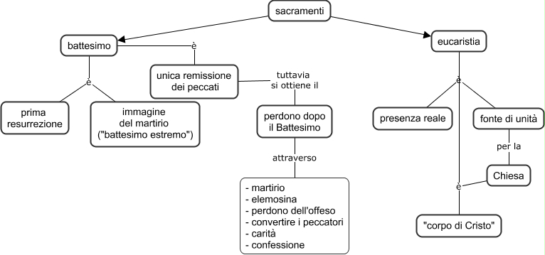 Questa Cmap, creata con IHMC CmapTools, contiene informazioni relative a: 60 Origene - Sacramenti, battesimo è unica remissione dei peccati, battesimo è prima resurrezione, Chiesa è "corpo di Cristo", sacramenti battesimo, sacramenti eucaristia, fonte di unità per la Chiesa, eucaristia è presenza reale, eucaristia è fonte di unità, unica remissione dei peccati tuttavia si ottiene il perdono dopo il Battesimo, perdono dopo il Battesimo attraverso - martirio - elemosina - perdono dell'offeso - convertire i peccatori - carità - confessione, eucaristia è "corpo di Cristo", battesimo è immagine del martirio ("battesimo estremo")