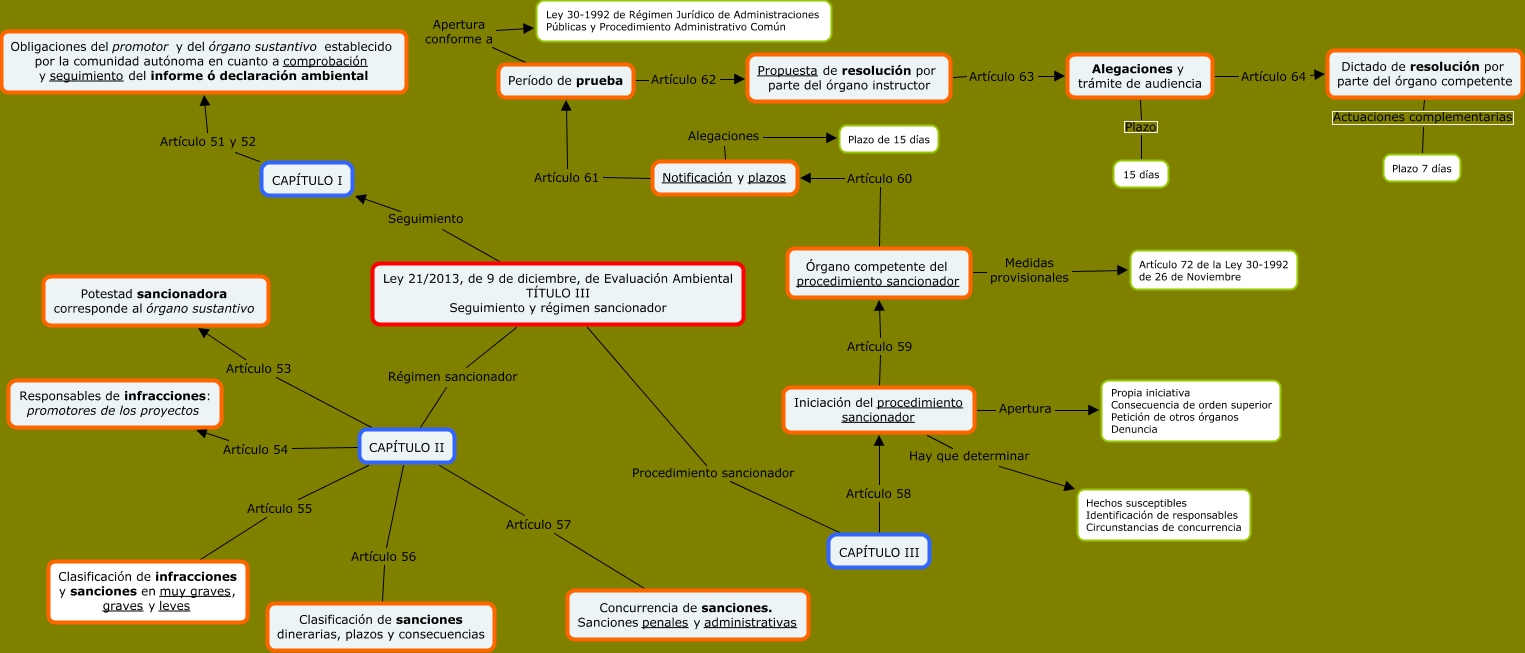This Concept Map, created with IHMC CmapTools, has information related to: Ley Ambiental, CAPÍTULO II Artículo 54 Responsables de infracciones: promotores de los proyectos, Período de prueba Artículo 62 Propuesta de resolución por parte del órgano instructor, CAPÍTULO II Artículo 56 Clasificación de sanciones dinerarias, plazos y consecuencias, Propuesta de resolución por parte del órgano instructor Artículo 63 Alegaciones y trámite de audiencia, Iniciación del procedimiento sancionador Apertura Propia iniciativa Consecuencia de orden superior Petición de otros órganos Denuncia, Período de prueba Apertura conforme a Ley 30-1992 de Régimen Jurídico de Administraciones Públicas y Procedimiento Administrativo Común, CAPÍTULO III Artículo 58 Iniciación del procedimiento sancionador, Alegaciones y trámite de audiencia Artículo 64 Dictado de resolución por parte del órgano competente, Ley 21/2013, de 9 de diciembre, de Evaluación Ambiental TÍTULO III Seguimiento y régimen sancionador Régimen sancionador CAPÍTULO II, Órgano competente del procedimiento sancionador Medidas provisionales Artículo 72 de la Ley 30-1992 de 26 de Noviembre, CAPÍTULO II Artículo 53 Potestad sancionadora corresponde al órgano sustantivo, Iniciación del procedimiento sancionador Hay que determinar Hechos susceptibles Identificación de responsables Circunstancias de concurrencia, Ley 21/2013, de 9 de diciembre, de Evaluación Ambiental TÍTULO III Seguimiento y régimen sancionador Seguimiento CAPÍTULO I, CAPÍTULO I Artículo 51 y 52 Obligaciones del promotor y del órgano sustantivo establecido por la comunidad autónoma en cuanto a comprobación y seguimiento del informe ó declaración ambiental, Notificación y plazos Artículo 61 Período de prueba, Ley 21/2013, de 9 de diciembre, de Evaluación Ambiental TÍTULO III Seguimiento y régimen sancionador Procedimiento sancionador CAPÍTULO III, Alegaciones y trámite de audiencia Plazo 15 días, CAPÍTULO II Artículo 57 Concurrencia de sanciones. Sanciones penales y administrativas, CAPÍTULO II Artículo 55 Clasificación de infracciones y sanciones en muy graves, graves y leves, Órgano competente del procedimiento sancionador Artículo 60 Notificación y plazos