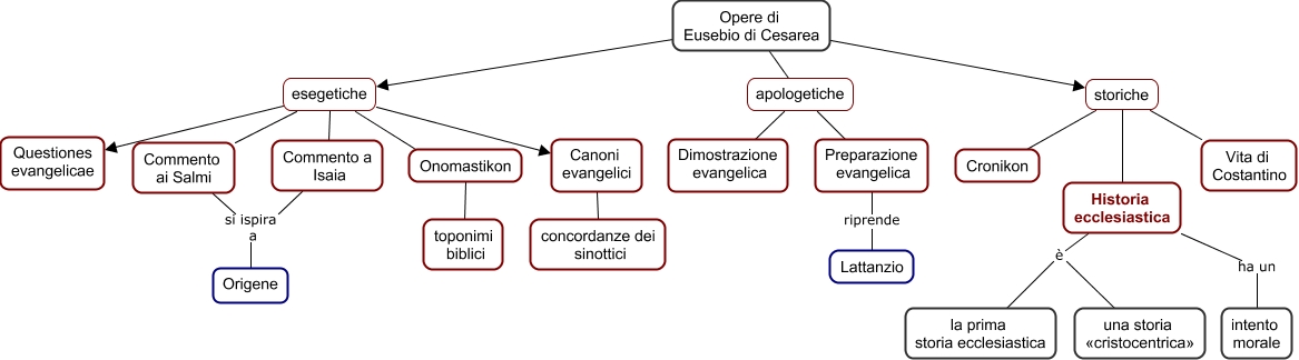 Questa Cmap, creata con IHMC CmapTools, contiene informazioni relative a: 63 Eusebio - Opere, storiche Historia ecclesiastica, esegetiche Canoni evangelici, storiche Vita di Costantino, storiche Cronikon, Commento a Isaia si ispira a Origene, Commento ai Salmi si ispira a Origene, Historia ecclesiastica ha un intento morale, Canoni evangelici concordanze dei sinottici, apologetiche Dimostrazione evangelica, apologetiche Preparazione evangelica, esegetiche Commento ai Salmi, Historia ecclesiastica è una storia «cristocentrica», Historia ecclesiastica è la prima storia ecclesiastica, Opere di Eusebio di Cesarea storiche, Opere di Eusebio di Cesarea apologetiche, Onomastikon toponimi biblici, Preparazione evangelica riprende Lattanzio, Opere di Eusebio di Cesarea esegetiche, esegetiche Commento a Isaia, esegetiche Questiones evangelicae