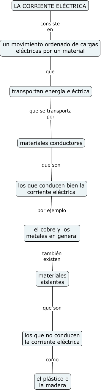 Este Cmap, tiene información relacionada con: La corriente eléctrica, materiales conductores que son los que conducen bien la corriente eléctrica, los que conducen bien la corriente eléctrica por ejemplo el cobre y los metales en general, transportan energía eléctrica que se transporta por materiales conductores, un movimiento ordenado de cargas eléctricas por un material que transportan energía eléctrica, LA CORRIENTE ELÉCTRICA consiste en un movimiento ordenado de cargas eléctricas por un material, materiales aislantes que son los que no conducen la corriente eléctrica, el cobre y los metales en general también existen materiales aislantes, los que no conducen la corriente eléctrica como el plástico o la madera