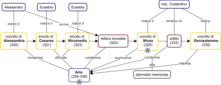 Questa Cmap, creata con IHMC CmapTools, contiene informazioni relative a: 65 Ario - La vicenda, concilio di Gerusalemme (335) riabilita Ario (256-336), concilio di Alessandria (320) sinodo di Cesarea (321), concilio di Nicea (325) concilio di Gerusalemme (335), concilio di Alessandria (320) condanna Ario (256-336), Eusebio indice il sinodo di Cesarea (321), editto (333) condanna alla damnatio memoriae, Alessandro scrive lettera sinodale (324), imp. Costantino indice concilio di Gerusalemme (335), sinodo di Cesarea (321) sinodo di Nicomedia (323), sinodo di Cesarea (321) difende Ario (256-336), Alessandro indice il concilio di Alessandria (320), imp. Costantino indice il concilio di Nicea (325), concilio di Nicea (325) scomunica Ario (256-336), lettera sinodale (324) condanna Ario (256-336), imp. Costantino emana un editto (333), Eusebio indice il sinodo di Nicomedia (323), sinodo di Nicomedia (323) difende Ario (256-336), editto (333) condanna Ario (256-336), lettera sinodale (324) concilio di Nicea (325), sinodo di Nicomedia (323) lettera sinodale (324)