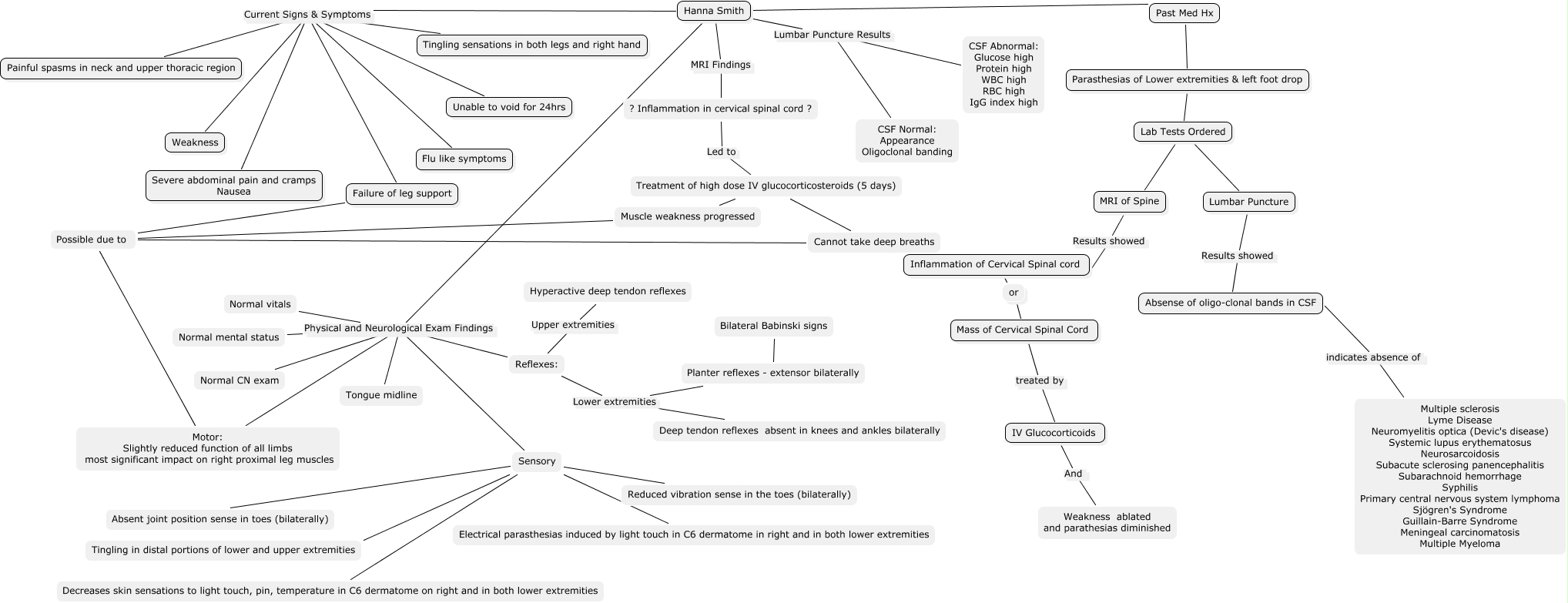 This Concept Map, created with IHMC CmapTools, has information related to: Hannah Smith, Hanna Smith Current Signs & Symptoms Failure of leg support, Hanna Smith Current Signs & Symptoms Weakness, or Inflammation of Cervical Spinal cord, Failure of leg support Possible due to, Hanna Smith Lumbar Puncture Results CSF Normal: Appearance Oligoclonal banding, Hanna Smith Current Signs & Symptoms Unable to void for 24hrs, Planter reflexes - extensor bilaterally Bilateral Babinski signs, Sensory Tingling in distal portions of lower and upper extremities, Past Med Hx Parasthesias of Lower extremities & left foot drop, Sensory Decreases skin sensations to light touch, pin, temperature in C6 dermatome on right and in both lower extremities, Hanna Smith Current Signs & Symptoms Painful spasms in neck and upper thoracic region, Reflexes: Upper extremities Hyperactive deep tendon reflexes, Hanna Smith Physical and Neurological Exam Findings Motor: Slightly reduced function of all limbs most significant impact on right proximal leg muscles, Hanna Smith Physical and Neurological Exam Findings Reflexes:, Sensory Reduced vibration sense in the toes (bilaterally), Hanna Smith Physical and Neurological Exam Findings Sensory, ? Inflammation in cervical spinal cord ? Led to Treatment of high dose IV glucocorticosteroids (5 days), Sensory Absent joint position sense in toes (bilaterally), Reflexes: Lower extremities Planter reflexes - extensor bilaterally, Parasthesias of Lower extremities & left foot drop Lab Tests Ordered