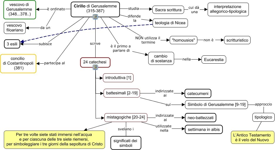 Questa Cmap, creata con IHMC CmapTools, contiene informazioni relative a: 69 Cirillo di Gerusalemme, mistagogiche [20-24] svelano i significati dei simboli, mistagogiche [20-24] utilizzate nella settimana in albis, mistagogiche [20-24] indirizzate ai neo-battezzati, Simbolo di Gerusalemme [9-19] approccio tipologico, Sacra scrittura cui dà una interpretazione allegorico-tipologica, Cirillo di Gerusalemme (315-387) NON utilizza il termine "homousios", tipologico L’Antico Testamento è il velo del Nuovo, Cirillo di Gerusalemme (315-387) studia Sacra scrittura, battesimali [2-19] indirizzate ai catecumeni, cambio di sostanza nella Eucarestia, 24 catechesi introduttiva [1], Cirillo di Gerusalemme (315-387) è ordinato vescovo di Gerusalemme (348...378..), Cirillo di Gerusalemme (315-387) difende la teologia di Nicea, mistagogiche [20-24] Per tre volte siete stati immersi nell’acqua e per ciascuna delle tre siete riemersi, per simboleggiare i tre giorni della sepoltura di Cristo, Cirillo di Gerusalemme (315-387) è ordinato da un vescovo filoariano, Cirillo di Gerusalemme (315-387) scrive 24 catechesi, "homousios" non è scritturistico, Cirillo di Gerusalemme (315-387) subisce 3 esili, Cirillo di Gerusalemme (315-387) è il primo a parlare di cambio di sostanza, 24 catechesi battesimali [2-19]